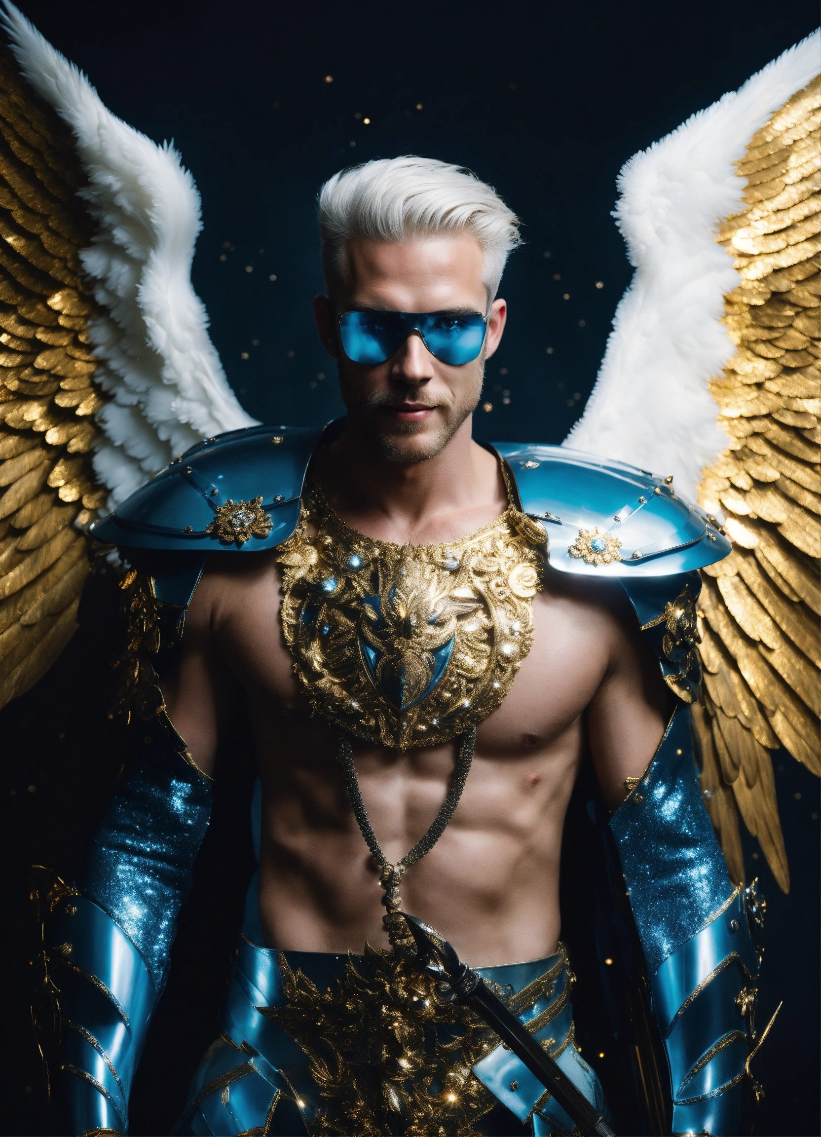 iconoclastic surrealistic photograph portrait of happy, smiling, handsome gorgeous fit masculine Archangel young white supermodel male, friendly smile, holding a dazzling sword of light, staring intensely straight ahead directly into camera, massive white wings spreading out from his back, wearing a crown designed my Alexander McQueen, long full platinum hair and full platinum beard, glowing blue eyes centred towards me, wearing futuristic sparkling blue and gold diamond body armour over a sparkling white tunic with high neckline, NO CHEST SHOWING symmetrical, iconic, striking, award winning photo, powerful, emotional, editorial fantasy magazine photo by Alessio Albi, background is sparkling clouds in sunny blue sky. Film Grain.