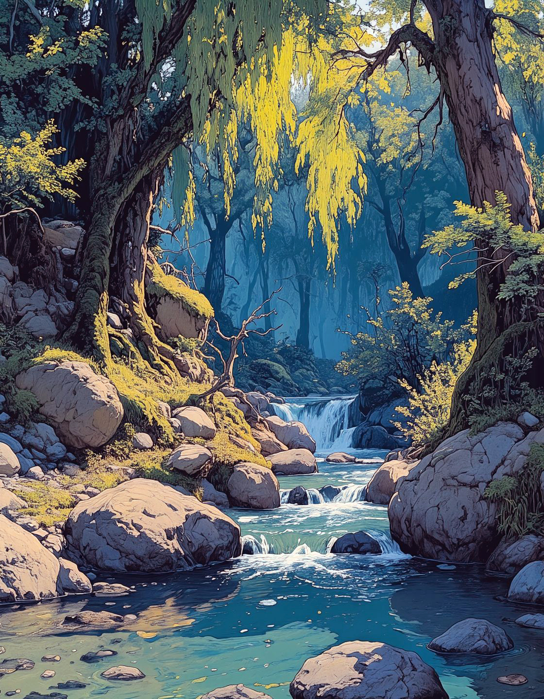 surrealist art anime artwork serene forest river surrounded by overhanging willows,Celestial observatory woodland with aurora-powered growth acceleration during solar storms, Artists creating music visible as colored mist, A lagoon holding liquefied starlight coral towers emitting radio frequencies, a second sun reflected from oceanic mirror zones, Groves of petrified cherry blossoms frozen mid-fall, century-long cycles creating obsidian rose fields, rain ascending into self-organizing sculptures,,