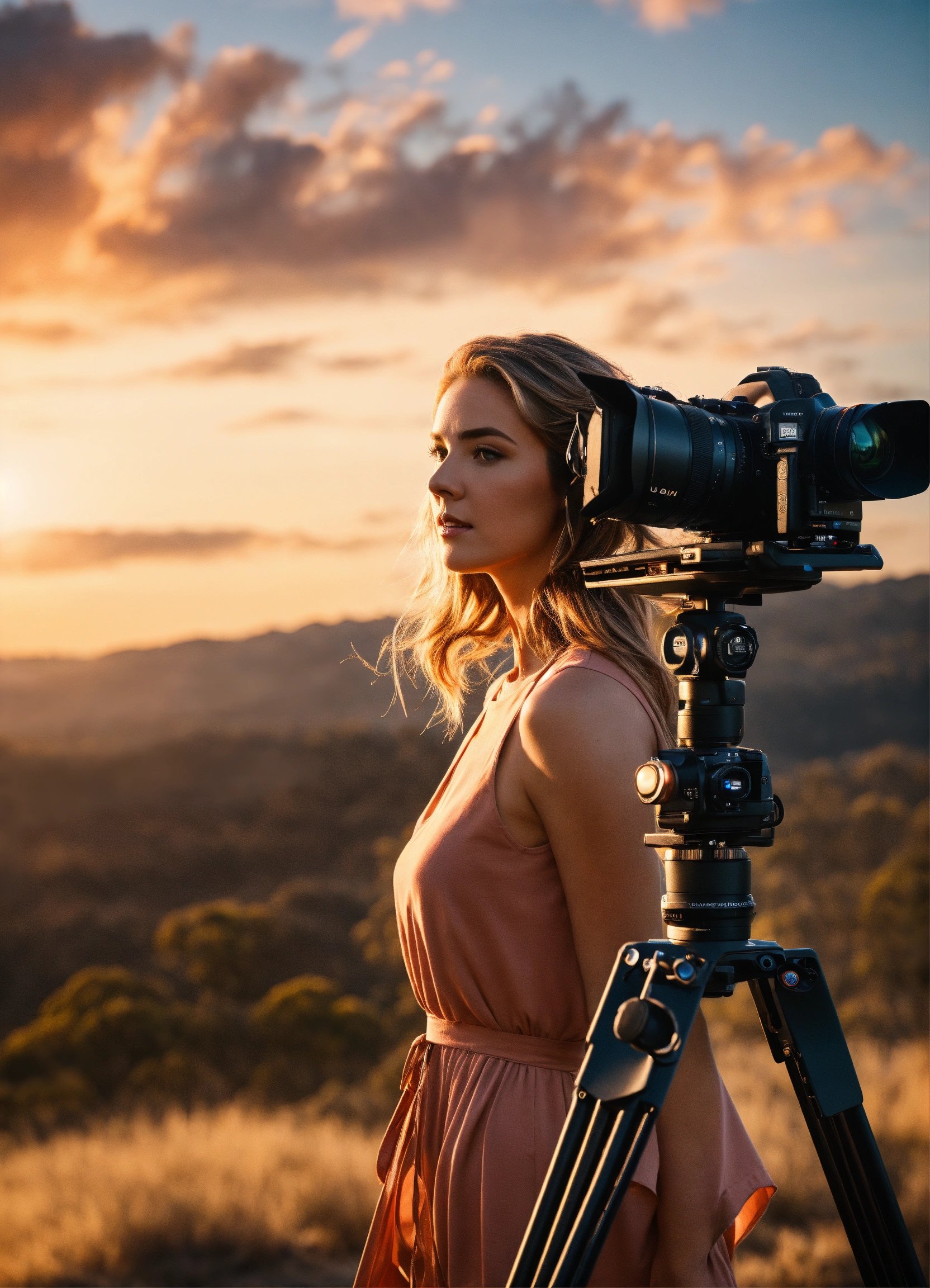 high quality, 8K Ultra HD, masterpiece, realistic photo, making of, wide shot, full body, a videographer with professional equipments, with professional light setting, Australian actress talent in front of camera, Australia background