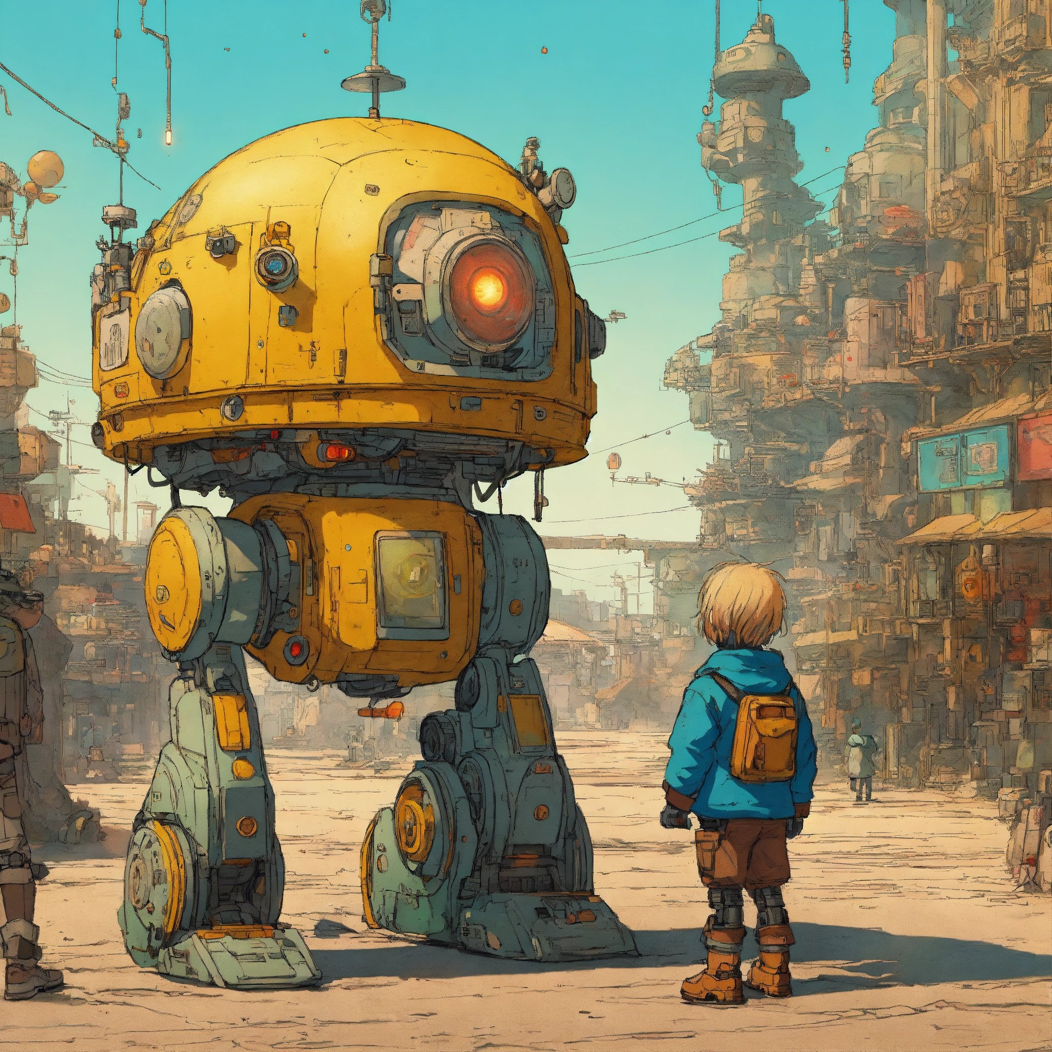 幼い子どもと巨大ロボットが寄り添う、身長差・体格差が際立つフューチャーパンク描写。カラフルな光、晴天、超高品質なワイドショットで全体の雰囲気を捉えた構図。
