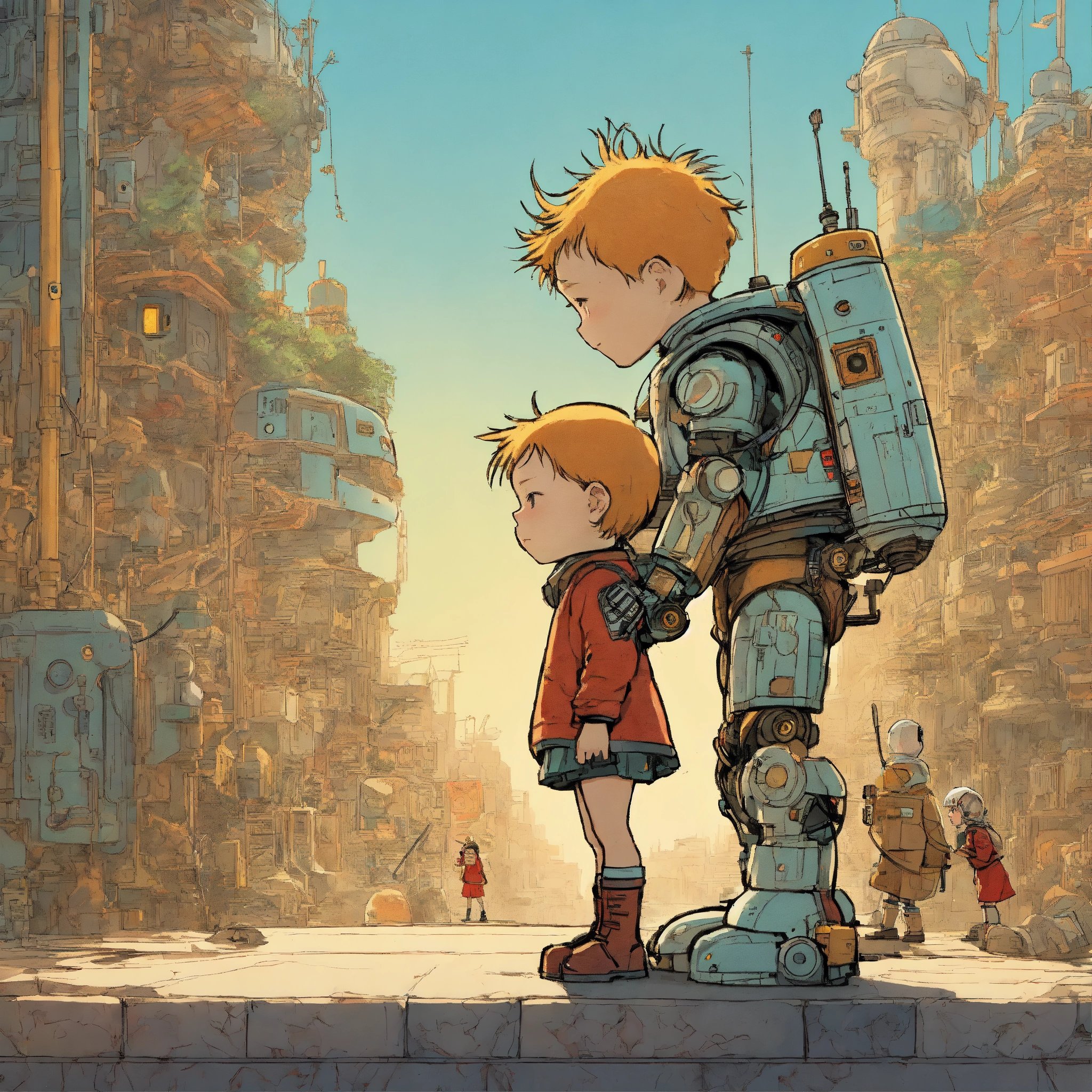 Futurepunk child and robot hugging each other, sunny day, colorful lighting, side view of the characters, sci-fi atmosphere, ultra-high definition (UHD), very detailed, by Mattias Adolfsson