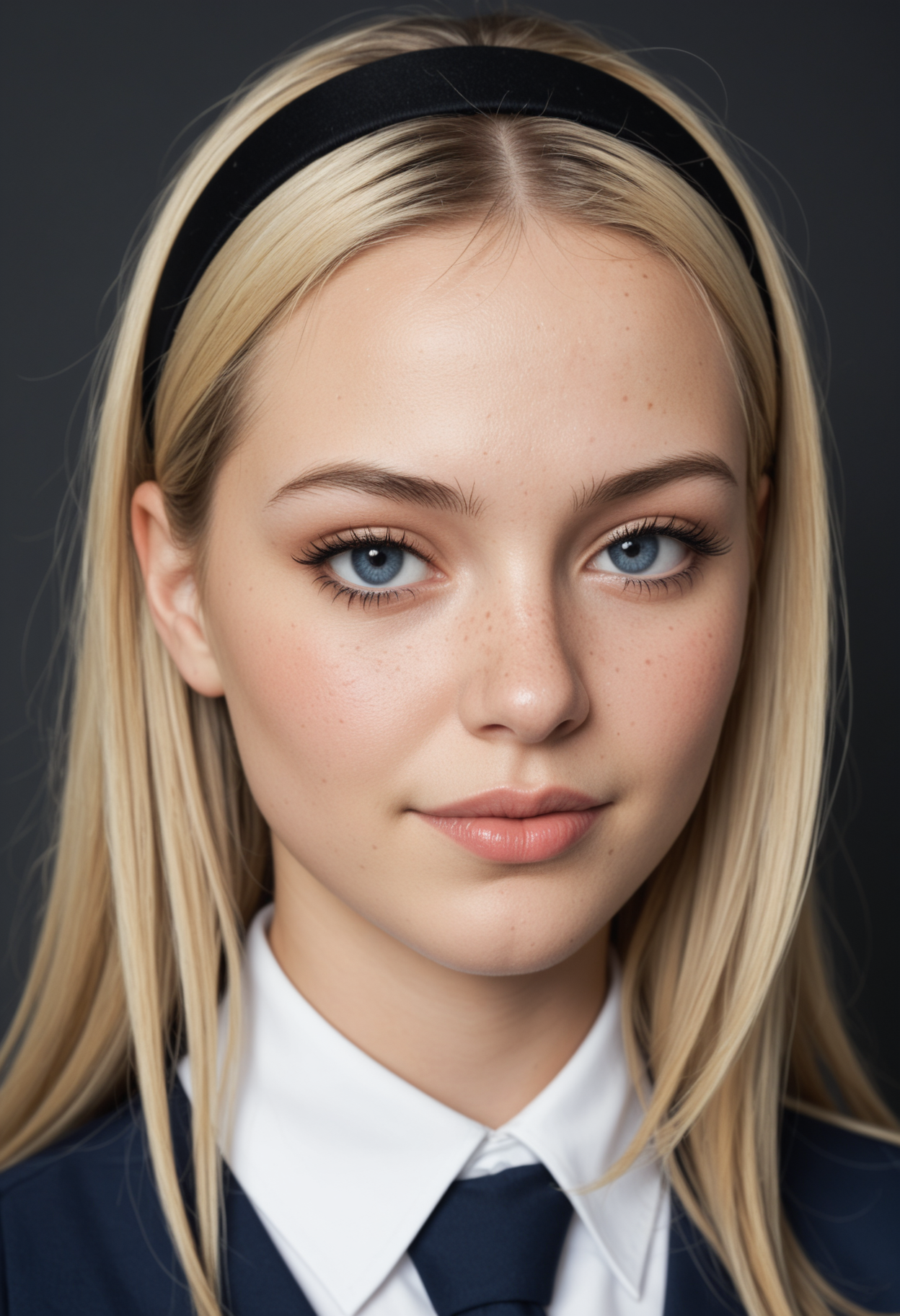 フレッシュなそばかすと重いメイクの女性が、前向きでシネマティックに表現。ブロンド直毛ミドル分け、黒いヘアバンド、学生制服で清潔感と個性を両立。