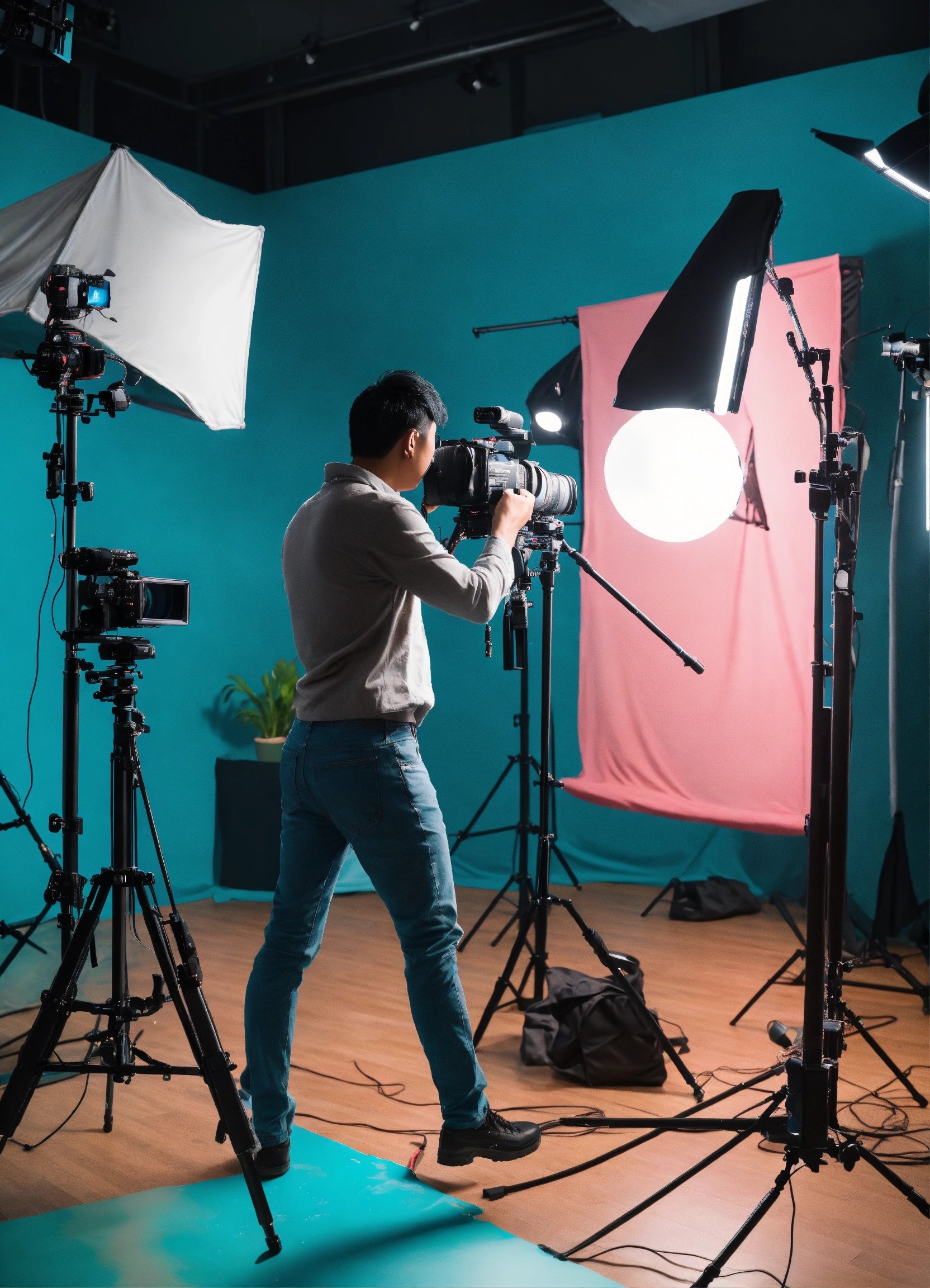 high quality, 8K Ultra HD, masterpiece, realistic photo, wash technique, colorful, pale touch, smudged outline, making of scene in a studio, wide shot, an asian videographer shooting in a studio, with professional equipmemts, professional lighting setting, an Australian talent with colorful costume, grey cyan harmony color tone