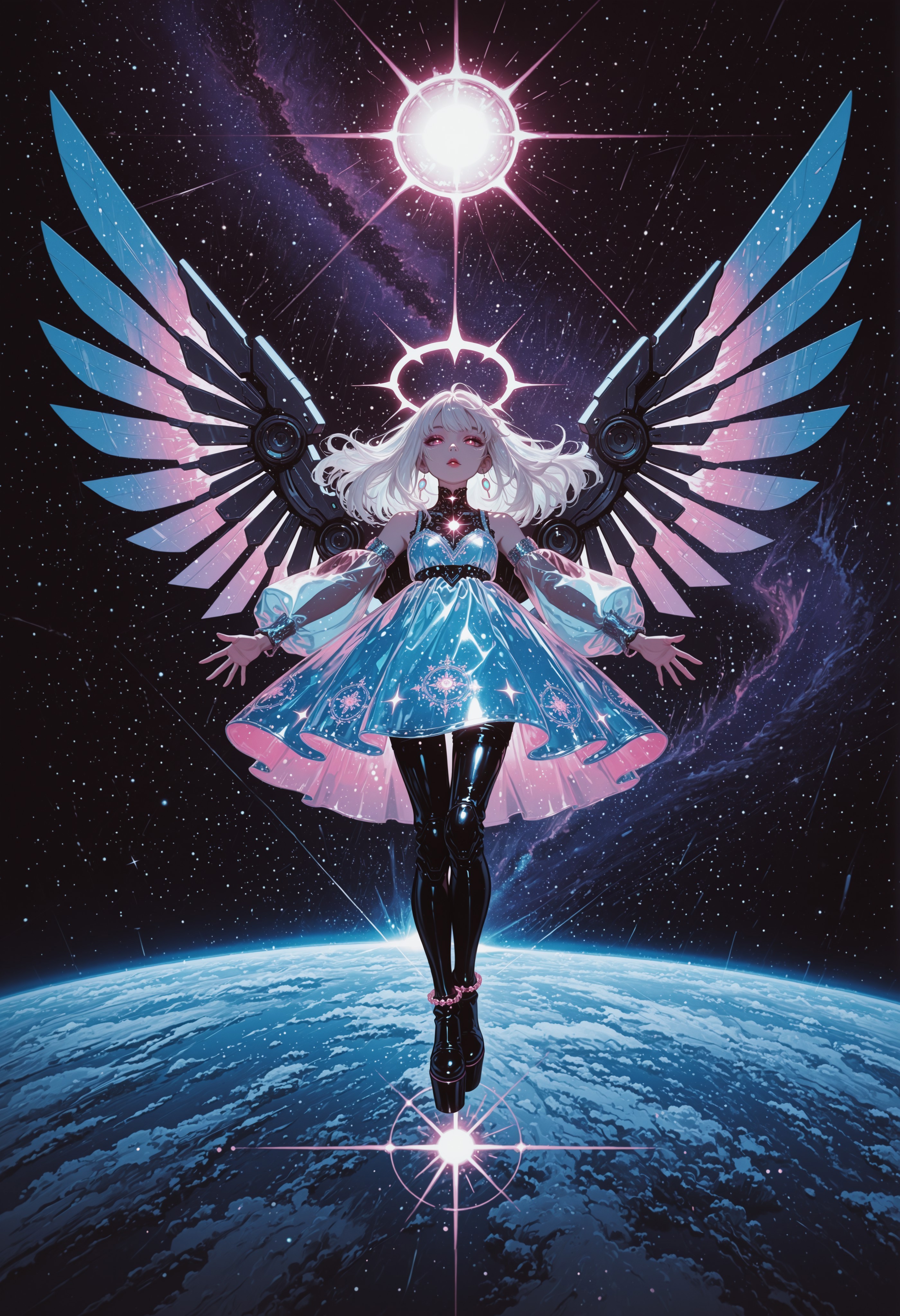 (robot joints:0.5), sci-fi space theme, large spread mechanical wings, (mechanical wings, robot wing:1.2), glowing neon cyberpunk futuristic armor, mecha armor, latex neon bright light dress, (translucent sleeves, translucent skirt), (holographic clothing, iridescent), neon white latex stockings, glowing halo, neon boots, platform footwear, jewel trim, jewel armlet, jewel anklet, jewelry, (ornate dress, embroidery, embroidered dress:1.2),
