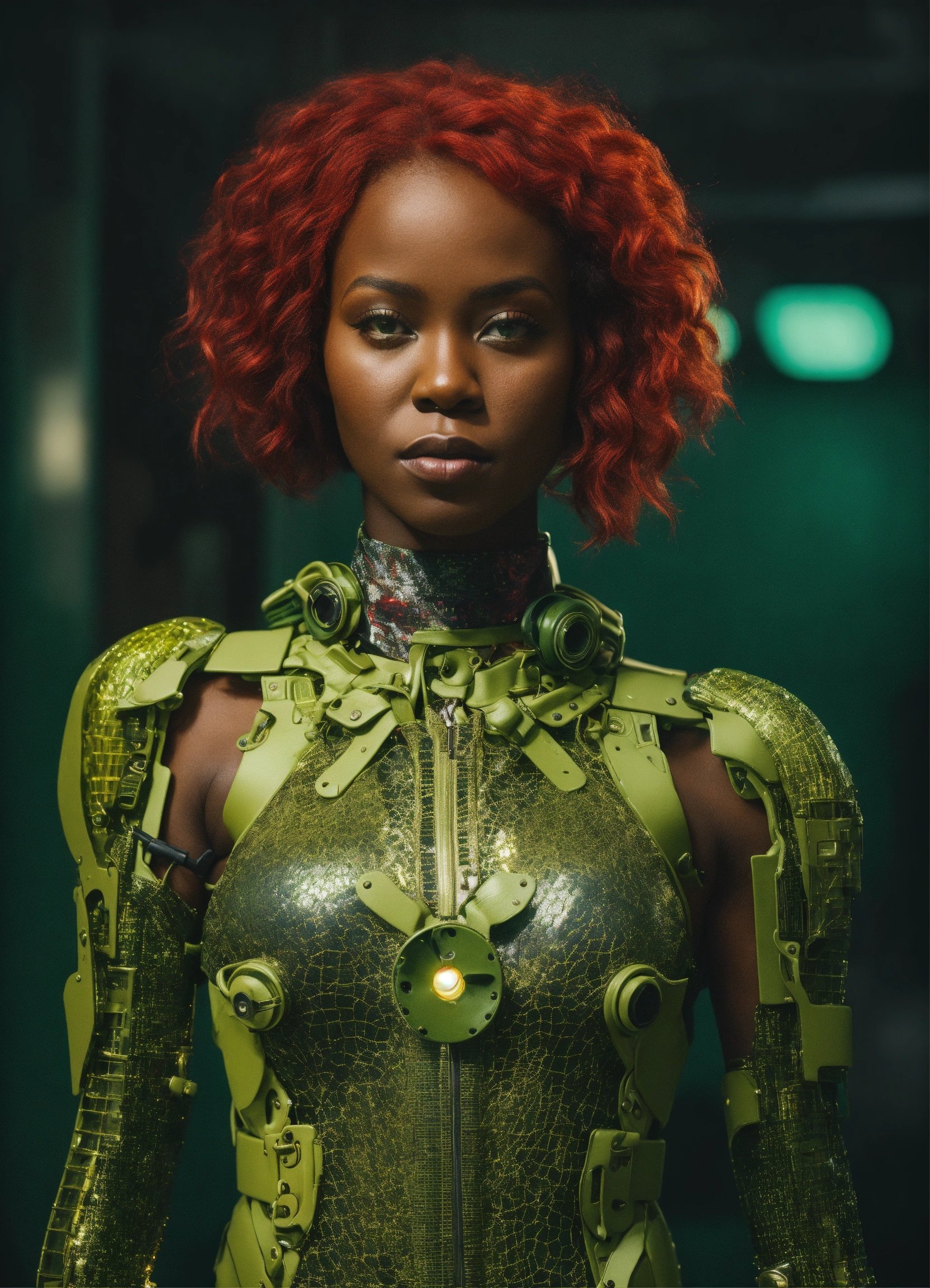 A full body portrait of a black woman with red hair, green eyes wearing prosthetic arms.