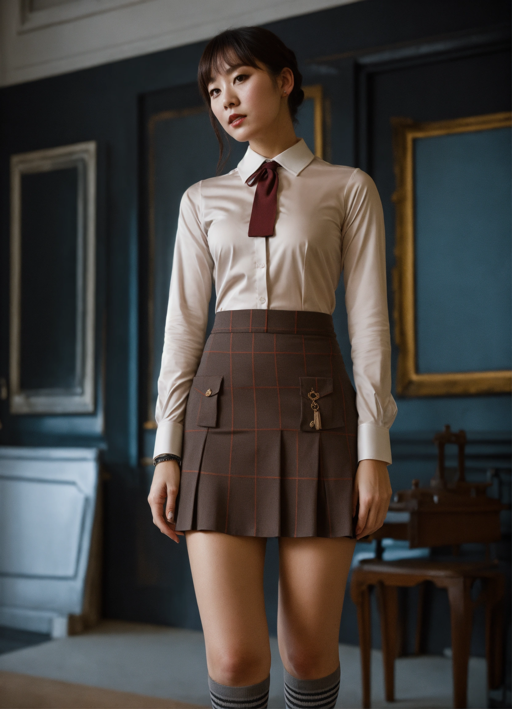 The british lady wearing a school uniform, tight shirt, skirt, socks, is posing in a room, in the style of dark academia, gongbi, dark bronze and gray, back button focus, fawncore, candid atmosphere, industrial chic, very tight shirt, wide bust