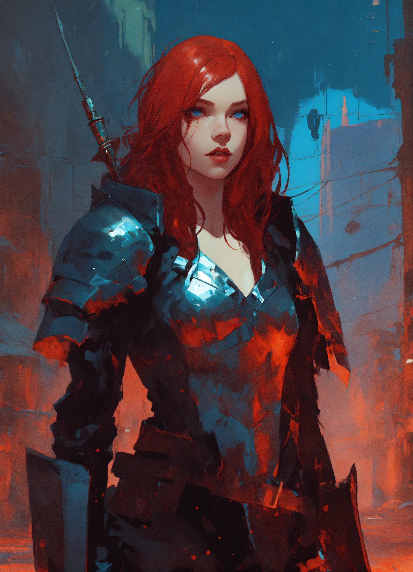ダークファンタジー甲冑を身につけた赤髪女性。ヴァンパイアのような悪の雰囲気を持つ騎士キャラクター。