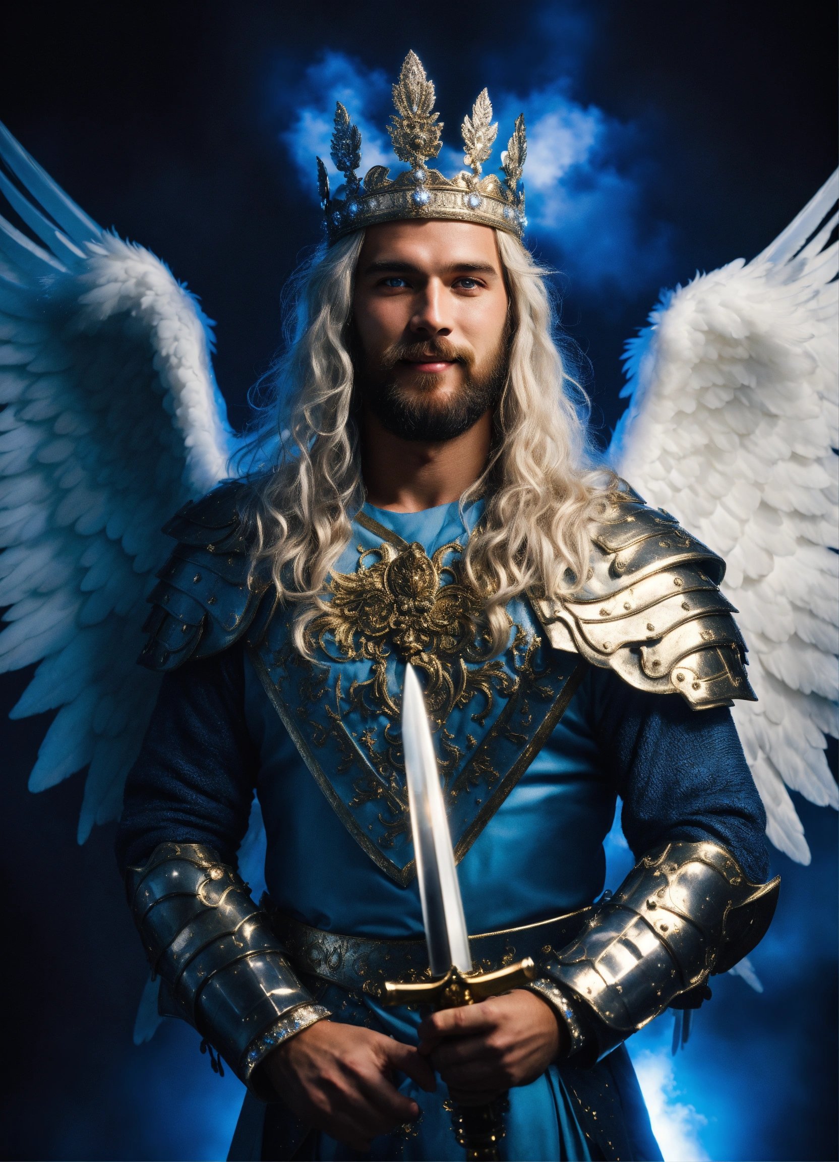 close-up photo portrait of bold fearless strong 28 year old masculine large handsome manly broad male joyous archangel warrior knight, smiling and staring directly into camera at me, massive white wings attached to his back, wearing a crown, glowing ice-blue eyes, long platinum hair and platinum beard, wearing heavily detailed blue and diamond body armour over a sparkly white monk robe covering his entire body, holding an elaborate holy sword of light, ethereal, symmetrical, iconic, fearsome, foggy, editorial fantasy photoshoot, background is sunlit clouds. Film Grain.