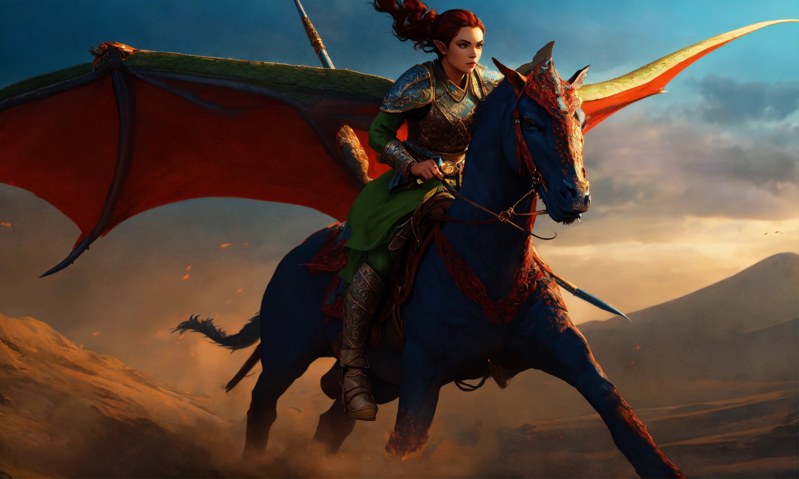 female Warrior elf based on timurid soldier, riding flying large red dragon, Turkish, green eyes, tan skin, dark, atmospheric lighting, cinematic composition, detailed face, detailed, detailed skin, art by daniela uhlig and brad rigney and adam hughe, dark blue clothes, mongolian plains.
