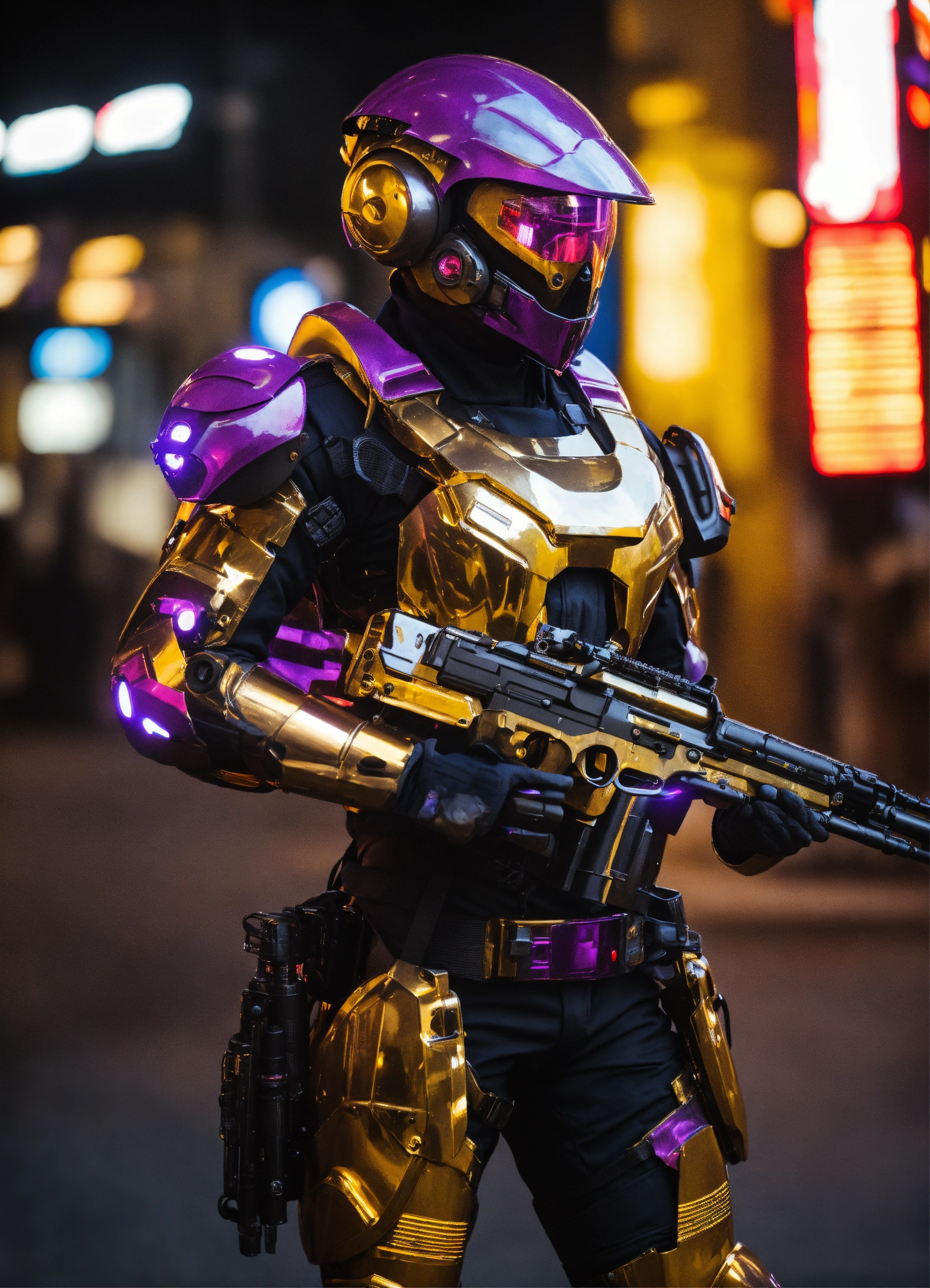未来的な重装甲を身に纏ったエチオピア系兵士。黒と紫と金色のサイバー装甲で、全身HD高品質。