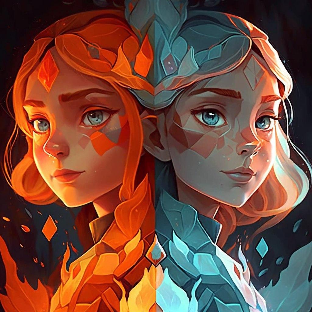 A detailed digital illustration of two girls embodying contrasting elements of fire and ice. Vivid orange hair and blue eyes for one, serene white hair and warm brown eyes for the other. The girls mirror each other with fiery and icy crowns, dressed in matching outfits, divided by a black background. The illustration captures a connection and balance between the opposites, with a composed and harmonious effect.
