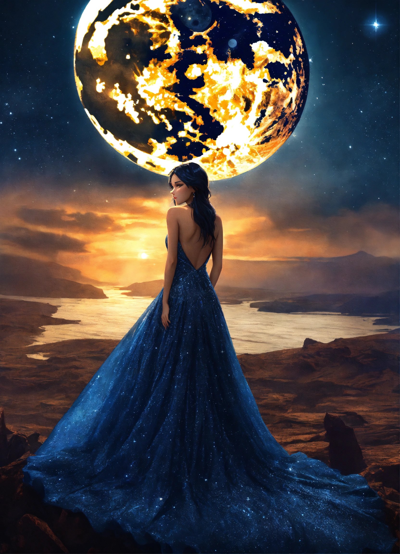 Madison Beer in a beautiful sparkling gown, dark blue hues, in a dystopian setting, back turned. stars raining down, a wolf with amber eyes watching her. Giant Moon, sunrise, realistic.
