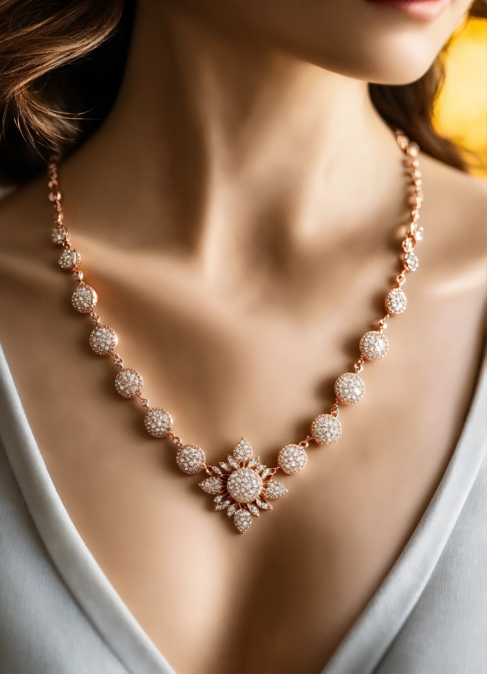 Jewellery design, vintage style, Create diamond rose gold necklace with matte finish in pave setting, thin band,christmas looking,design has number 8 pattern,small inch, default-theme, --product-view --ultra-quality