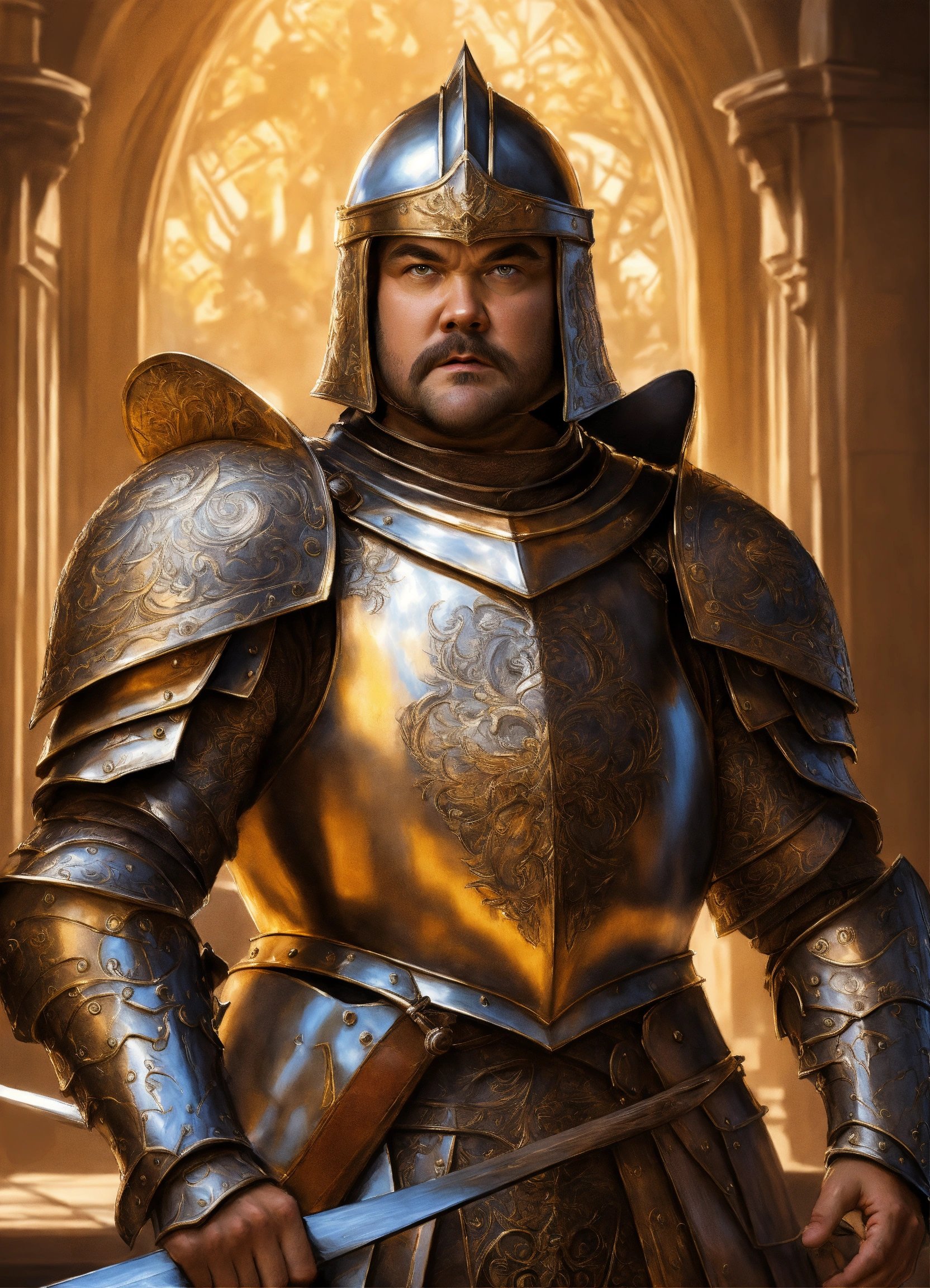 masterpiece, best quality, Jack Black in a royal knight armor with intricate design without helmet,D&D, fantasy, ink and pencil, digital art, greg rutkowski, artstation, 8 k, beautiful drawing, paper texture, highly detailed, concept art, sharp focus, ultra realistic illustration