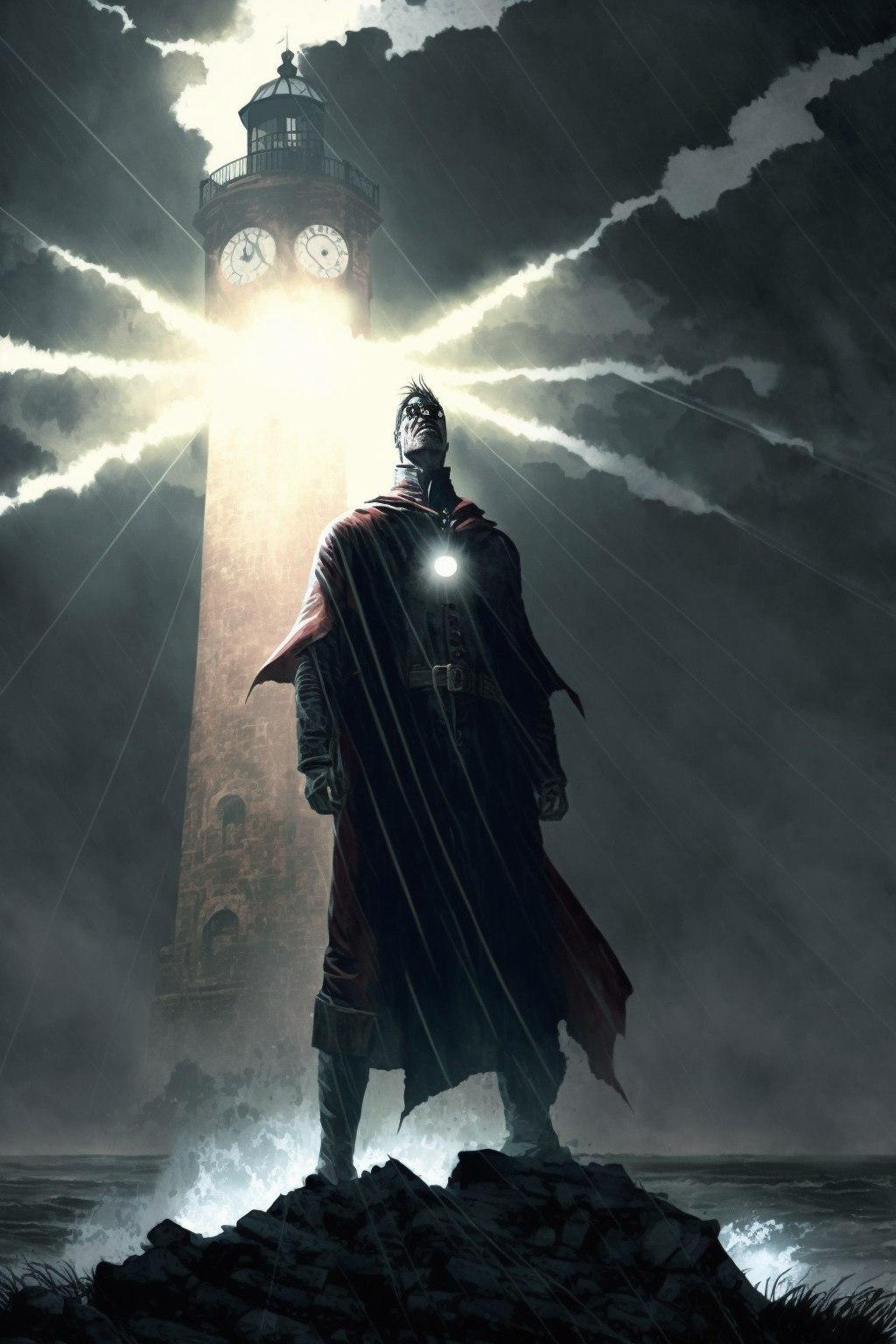 A majestic, atmospheric oil painting: a shrouded figure stands on stormy seascape rocks, gazing up at a radiant lighthouse. The sky dances with lightning; the man's eyes reflect the warm glow, adding mystery. The central figures are bathed in drama; the vast setting hints at a broader narrative.