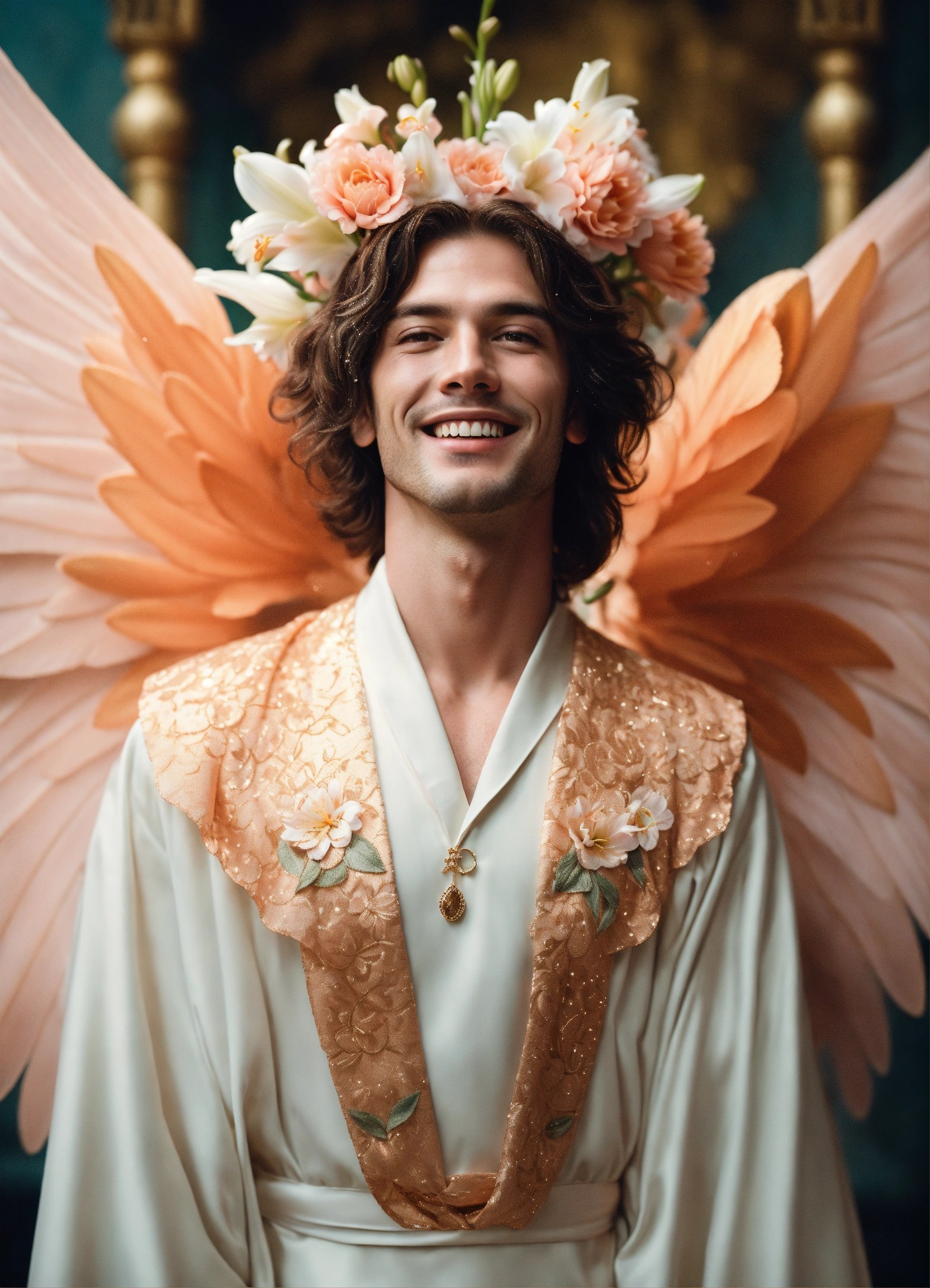 iconoclastic surreal photo portrait of happy, handsome fit joyous happy masculine Archangel male supermodel white blissfully joyous, gentle friendly smile, staring intensely straight ahead directly into camera at me, gigantic full white wings spreading out from his back, holding an lily, short brown hair, warm hazel eyes centred towards me, wearing sparkling intricately-detailed peach and white choir robes with high neckline, symmetrical, iconic, striking, award winning photo, powerful, emotional, editorial fantasy photoshoot, background is sparkling rain over a flower garden in the morning. Film Grain.