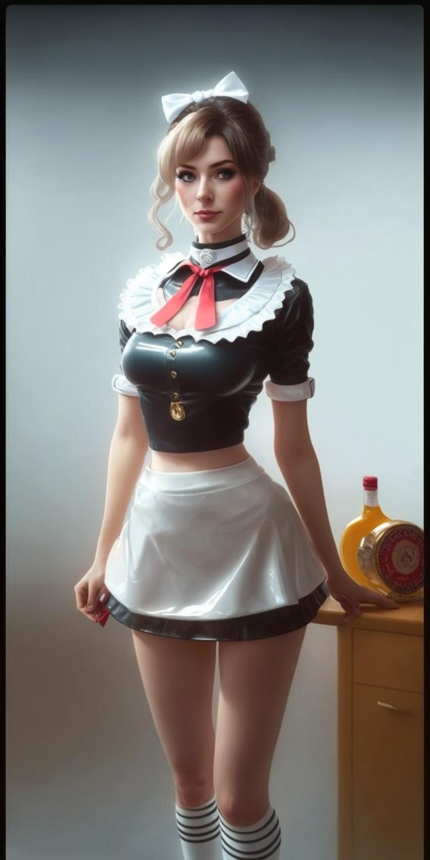 A stylish 3D render, featuring a charming maid in black and white, with a neat bun and white ribbon. Against a gray wall, she stands gracefully, inviting viewers with her gaze into the harmonious scene, where a wooden table holds wine and a glass.