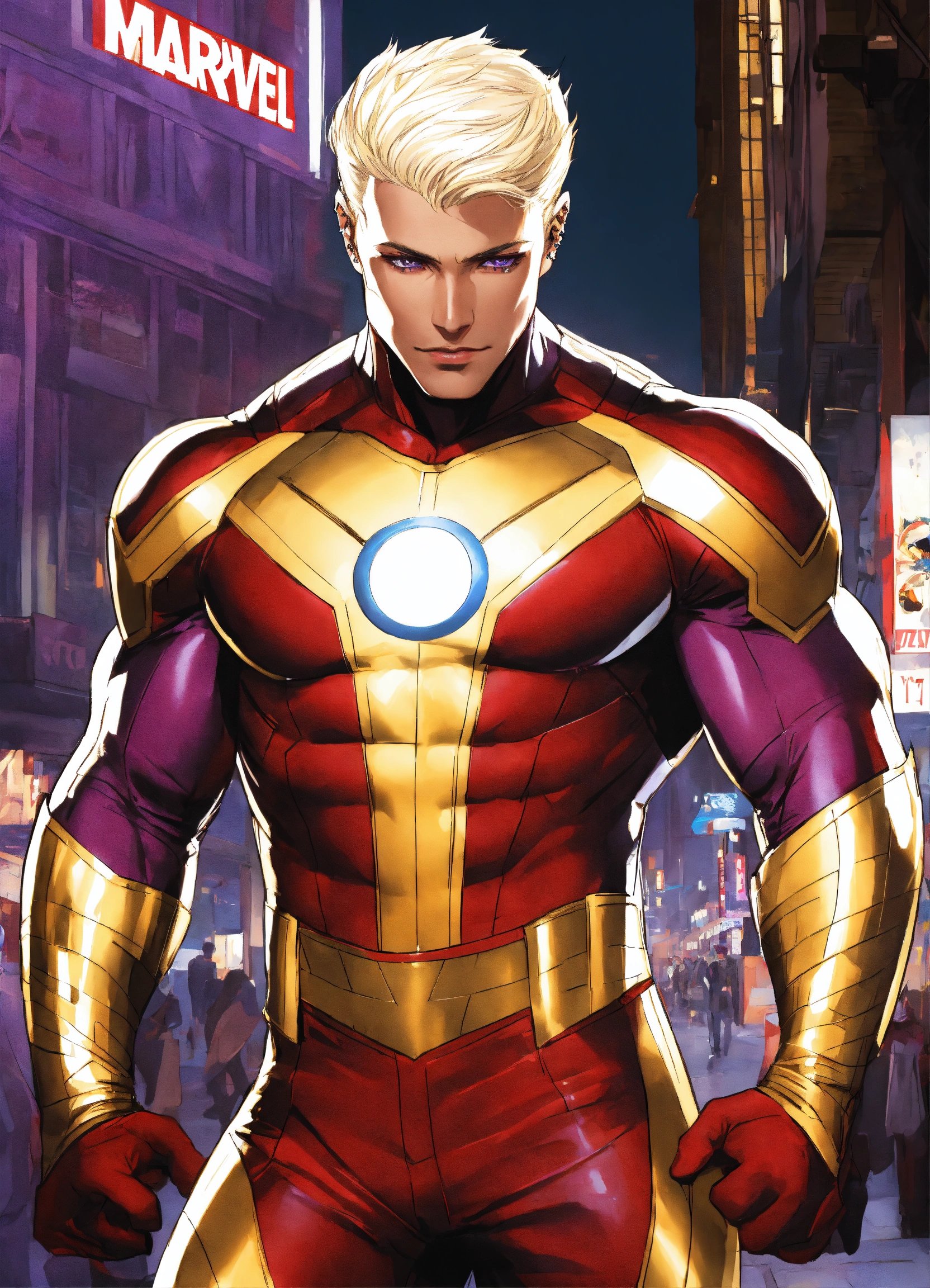 piercing violet eyes, marvel, highly detailed, white, red, and gold sleek costume, full body, smooth, no cape, muscular male, platinum blonde hair, on the side walk