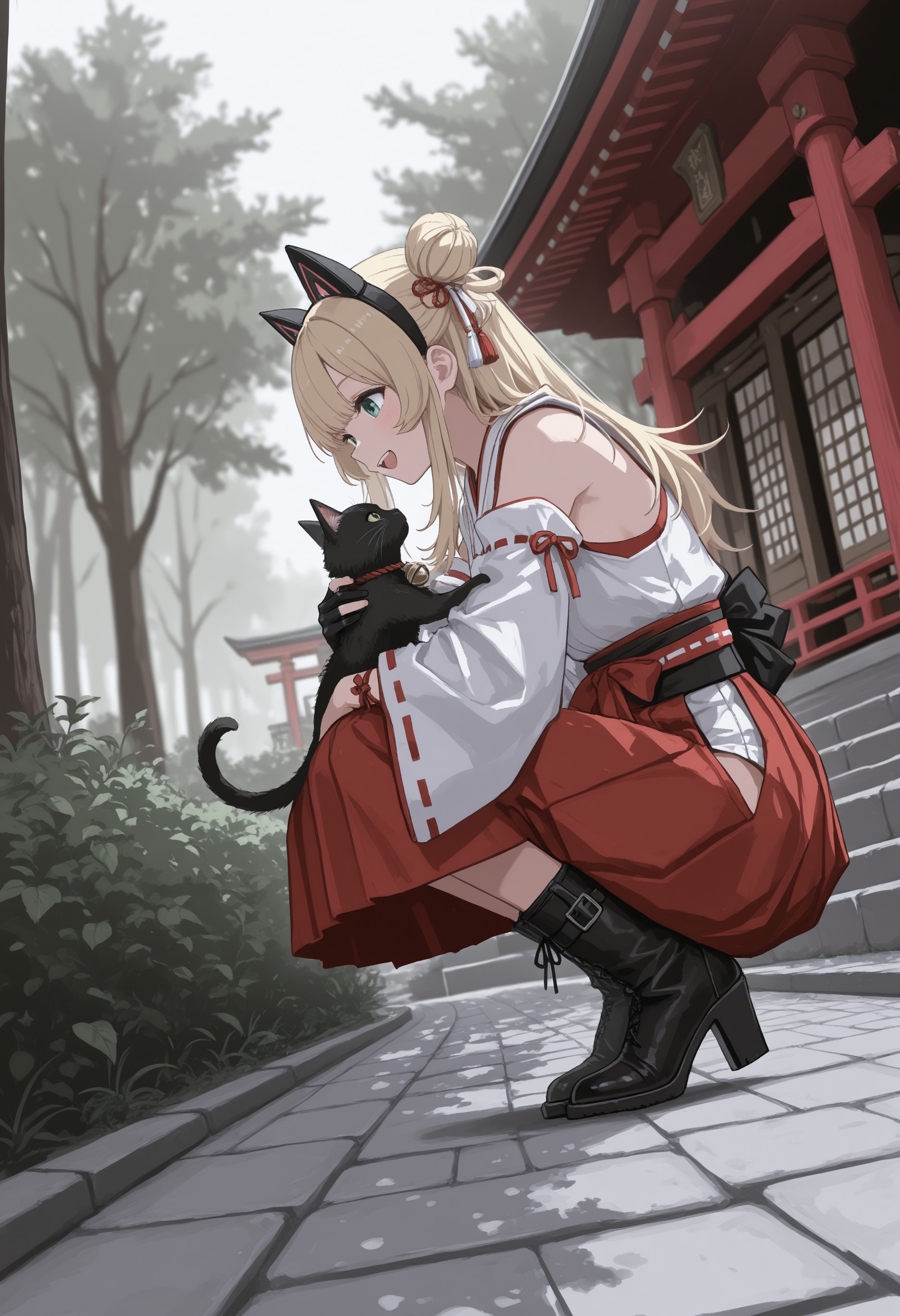 AudreyStrv, Adr_JP, blonde hair, aqua eyes, long hair, sidelocks, japanese clothes, miko, white kimono, sleeveless kimono, detached sleeves, furisode, cat ears, ribbon-trimmed sleeves, alt white sleeves, third-quarter sleeves, ribbon trim, black obi, obi, hip vents, rope around waist, white tassel, fake animal ears, hair tassel, single side bun, single glove, partially fingerless gloves, alt black gloves, wrist ribbon, red ribbon, hakama short skirt, red skirt, black thigh belt, bell, high heel boots, black high heel boots, gold colored shoe sole,