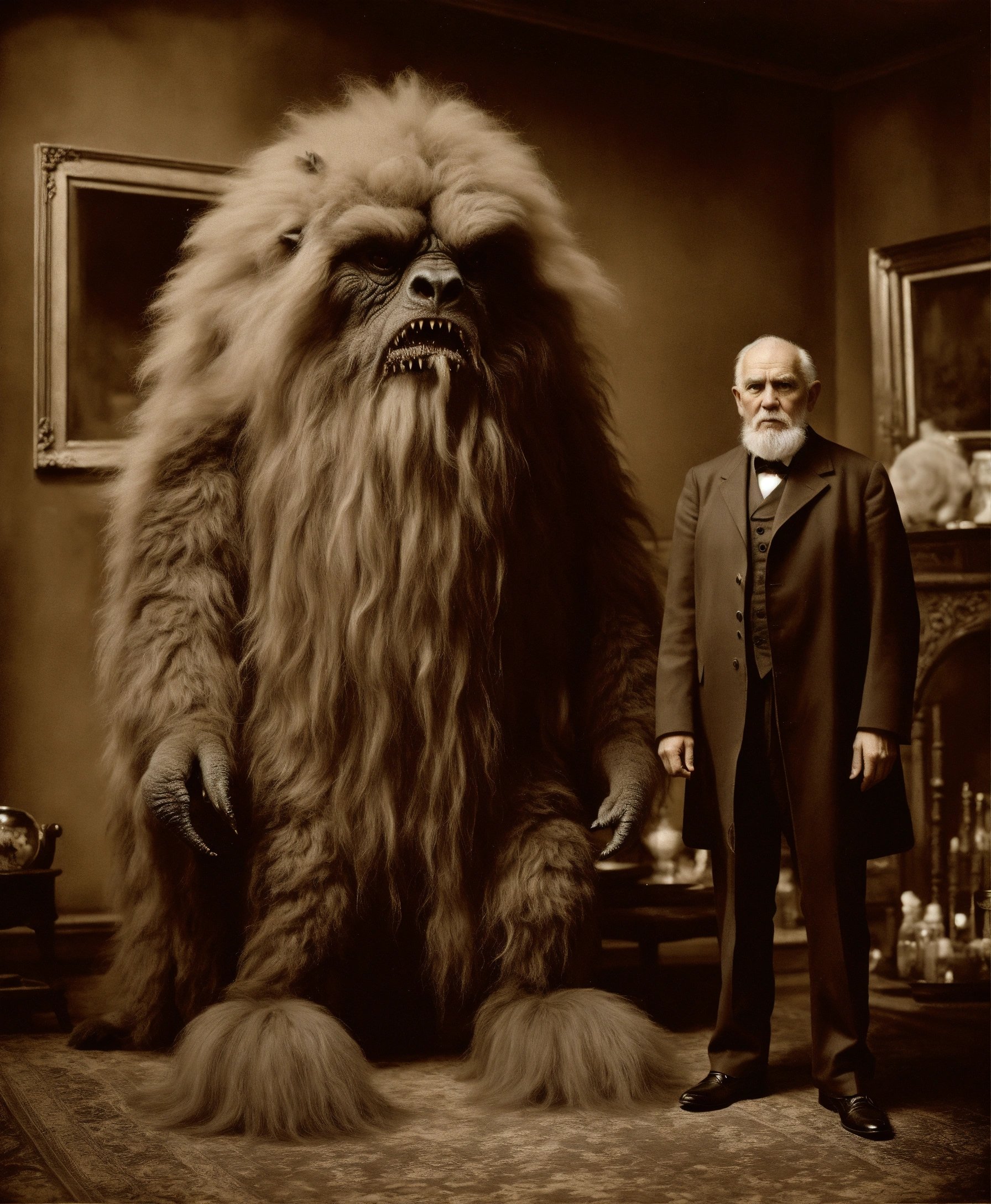 Old man standing next to a giant hairy baby monster, in the style of contemporary vintage photography, necronomicon illustrations, tabletop photography, 1890, hyperrealistic animal portraits, ghostly presence, dark and gloomy, whirring contrivances