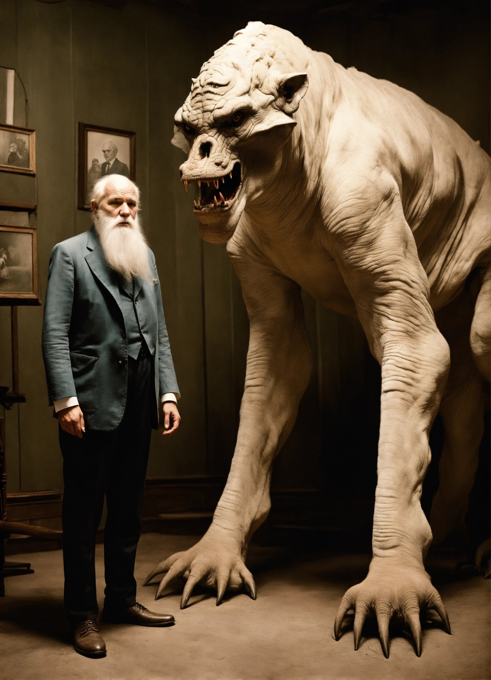 白人のアルビーノ老人と巨大怪物の体格差、ダークファンタジー