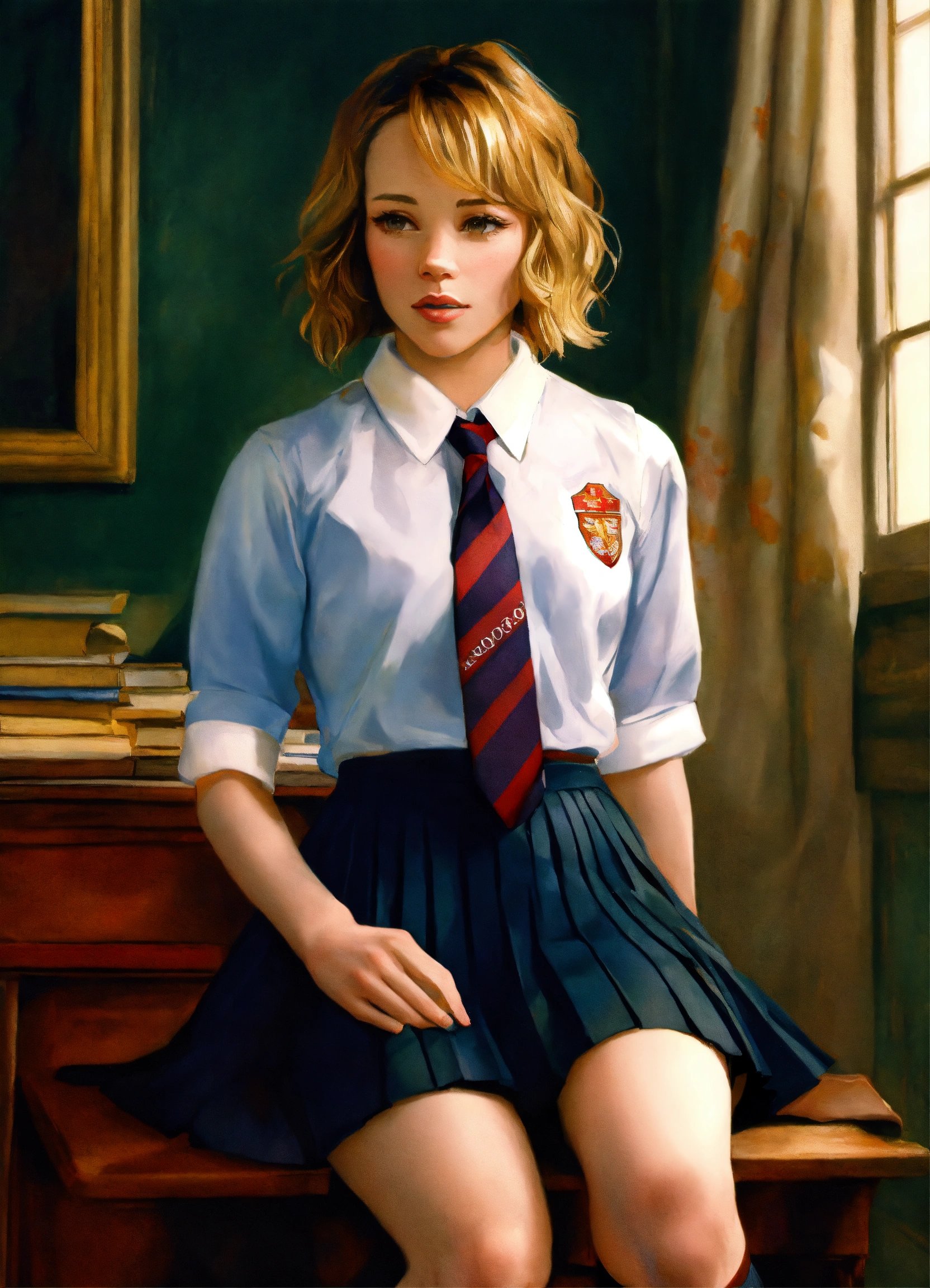 Rachel McAdams - un, school uniform, seifuku, pleated miniskirt, overknee socks. by rembrandt 1 6 6 7, illustration