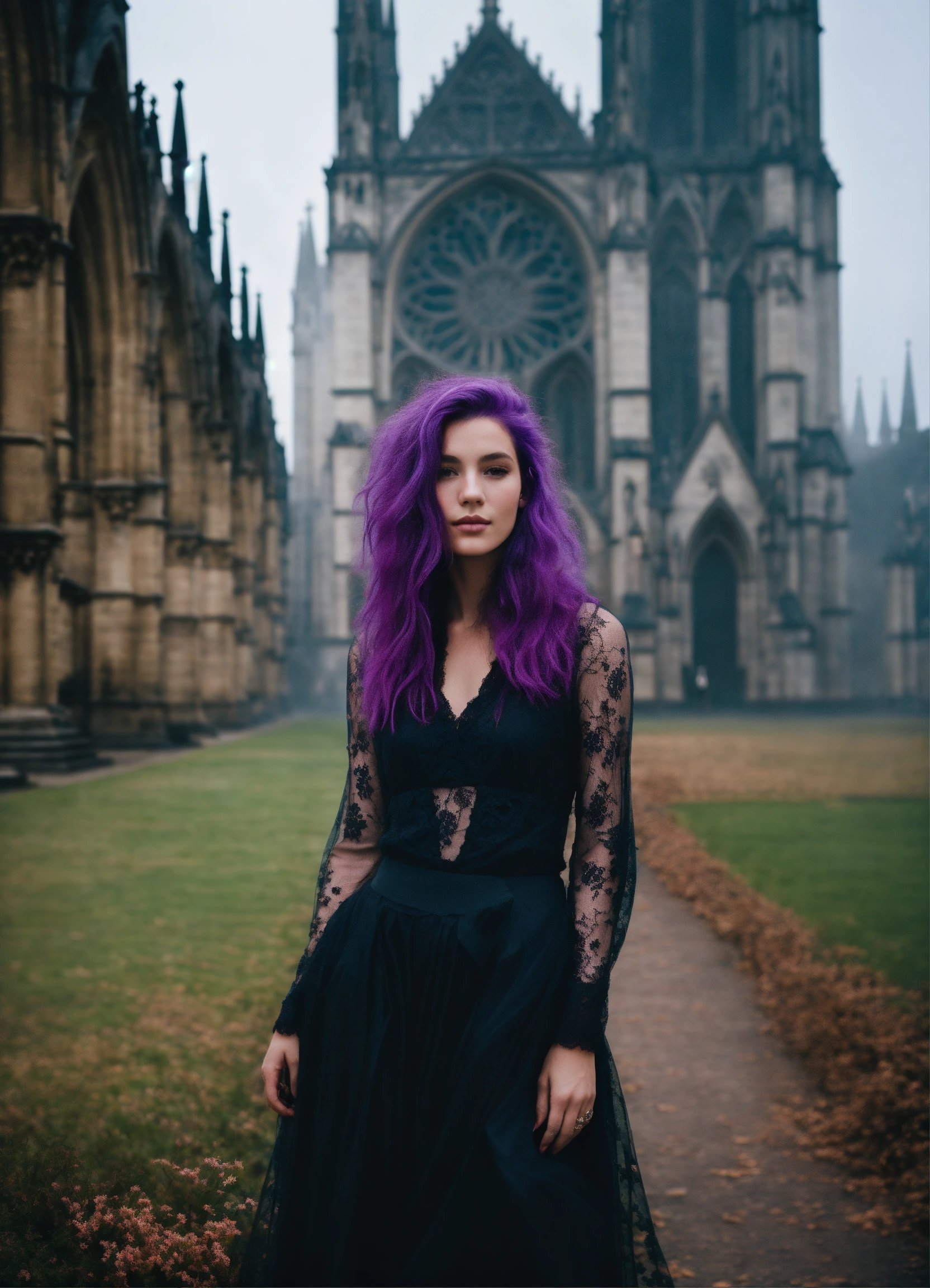 portrait of beautiful european fashion model with vibrant purple hair, ethereal dreamy foggy, photoshoot by Annie Leibovitz, editorial Fashion Magazine photoshoot, fashion poses, in front of gothic cathedral architecture. Kinfolk Magazine. Film Grain. a soft smile
