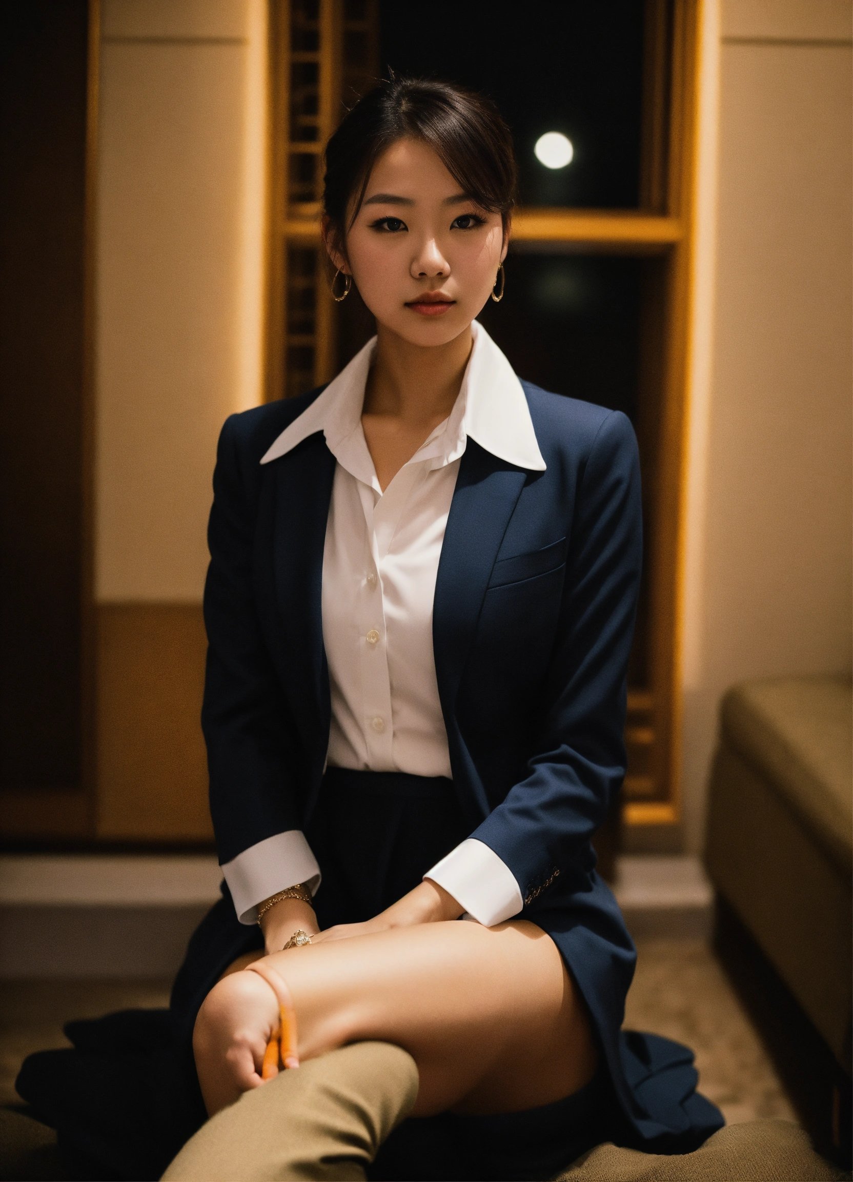 candid photo of a young Tokyo young woman taken at a luxury hotel suite during the night, she is sitting on the floor, high quality image, full shot, front view, super low angle, jpg artifacts, gritty, raw aesthetic Form-fitting, snug, close-fitting, constrictive, office attire, formal suit one piece mini skirt, elite, well-dressed, polished, sophisticated, form-fitting shirt, stylish, prestigious, layered, affluent, knee-high socks, upscale, traditional, Alluring, captivating, enchanting, beguiling, enticing, magnetic, charming, mesmerizing, tantalizing