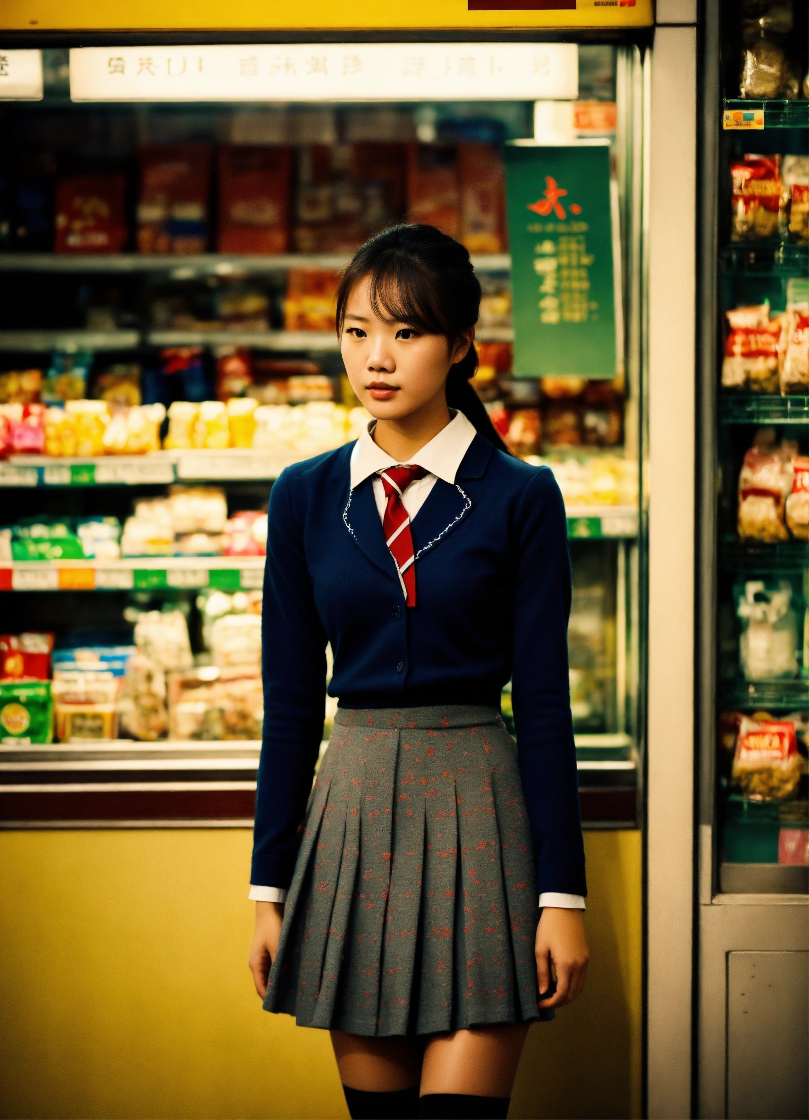 candid photo of a young Hong Kong woman taken at a convenience store during the night, low quality image, exhibiting a grainy texture, jpg artifacts, film grain, gritty, raw aesthetic Form-fitting, snug, close-fitting, constrictive, school attire, school uniform, Preppy, elite, well-dressed, polished, sophisticated, form-fitting shirt, stylish, prestigious, private school attire, layered, hosiery, affluent, knee-high socks, upscale, traditional, Alluring, captivating, enchanting, beguiling, enticing, magnetic, charming, mesmerizing, tantalizing