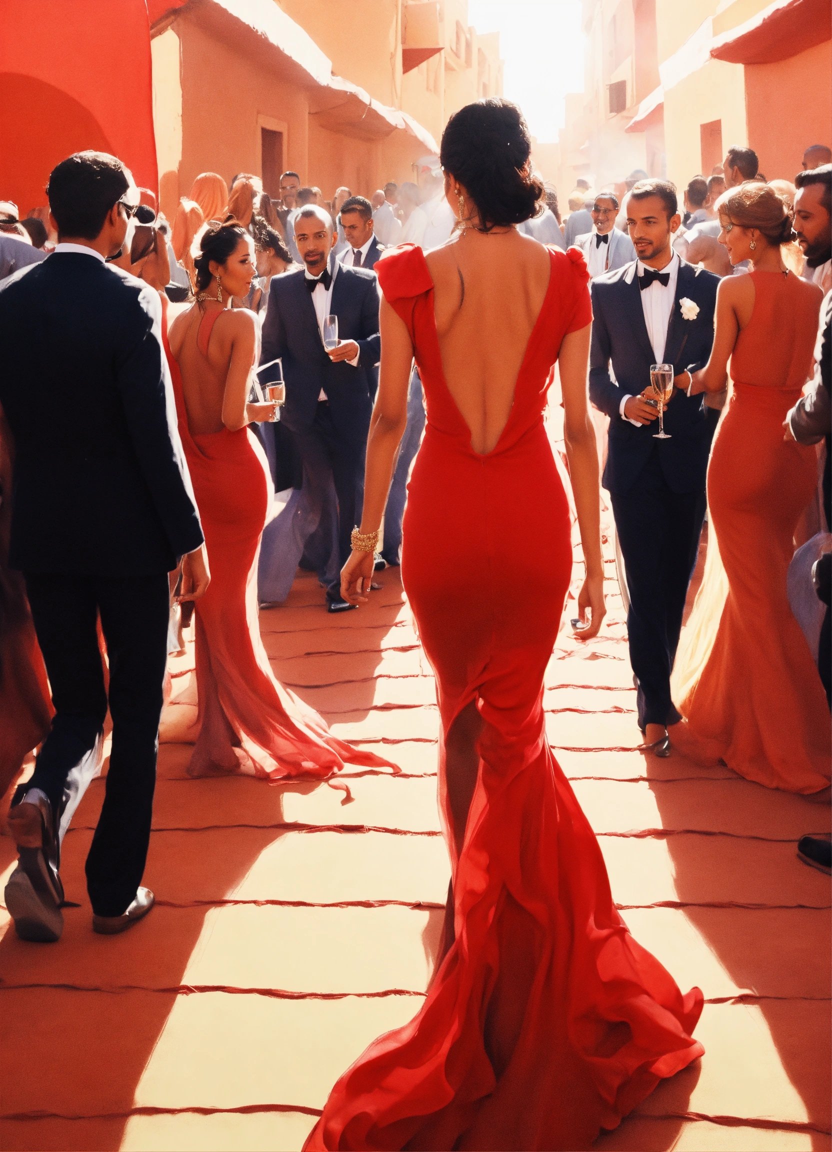 woman in a long red dress walking in a red carpet, a crowded party and paparazzis, in the sahara, drawing