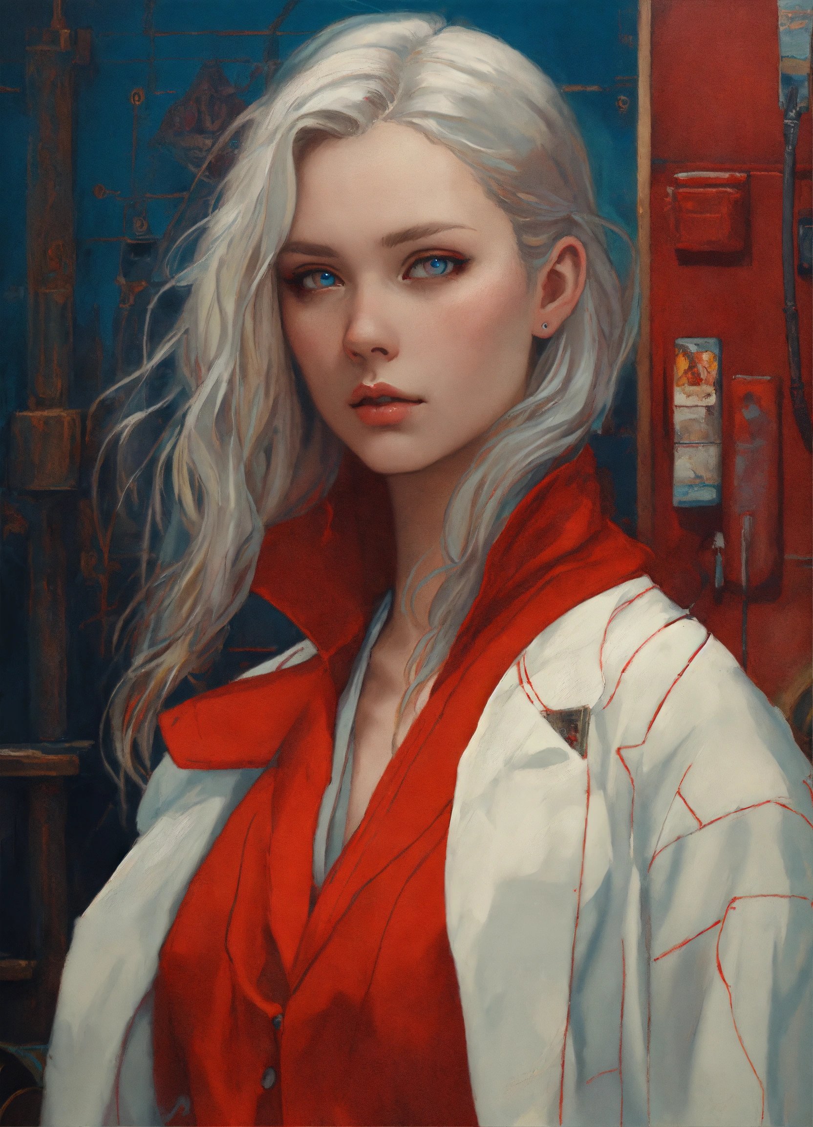 Portrait of a white woman, age 20, long silver hair, red stitches going up the left side of her neck, pale skin, red and blue eye, silver dress, mp5, white coat, cheek stitches, moody shadows, pallet knife, oil painting, brush strokes, intricate design, ethereal, alphonse mucha, Simon stalenhag, Chie yoshii, Casey Weldon, smooth, sharp focus, 8 k, octane render