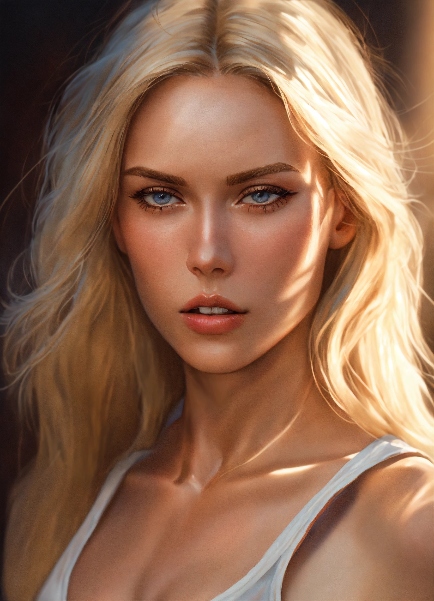 Full body potrait of thin beautiful faced tall woman with high cheekbones, pale skin, blonde hair, heavy chest, thin muscular midriff in pain, illustration, hyper realistic, highly detailed, side glamor pose, 4k, hdr, smooth, sharp focus, high resolution, realistic photography