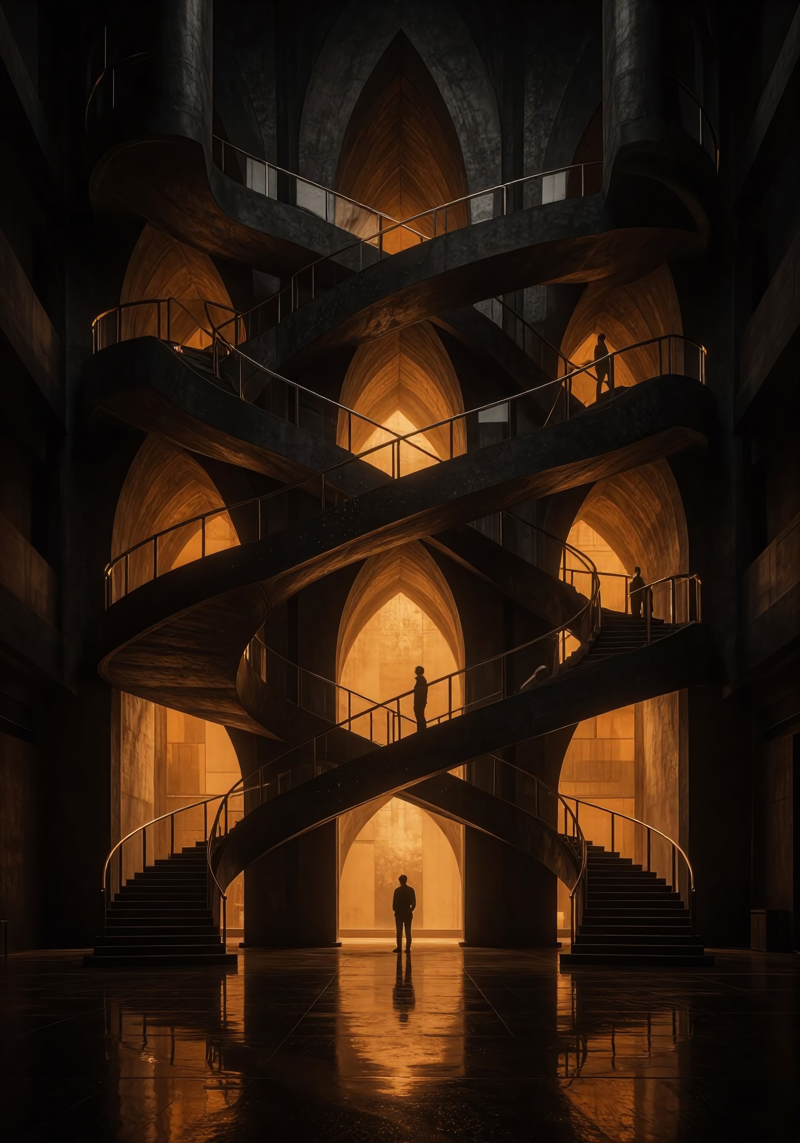 A grandiose minimalist cinematic interior, faithful to the reference: a monumental dark architectural space composed of sweeping sculptural spiral staircases stacked vertically, each ribbon-like stair curving through vast pointed arch openings filled with warm amber light, with two tiny solitary human silhouettes placed on separate landings and a glossy black floor reflecting the glowing arches and stair forms below. Vertical composition, straight-on view with a subtle low angle and a 35mm lens feel, strong central axial balance, repeating curved stair bands creating powerful leading lines and layered depth, vast negative space in the surrounding darkness, no dutch angle. Style is refined photoreal architectural surrealism with clean graphic simplicity, no extra elements. Cinematic lighting with intense warm backlight pouring through the arches, deep chiaroscuro shadows, soft volumetric haze, delicate glow wrapping the stair edges, subtle rim light on the silhouetted figures, restrained bloom on the brightest openings. Exquisite texture fidelity in matte stone or concrete surfaces, faint dust in the air, crisp stair edges, slim glass railings, polished reflective floor, and subtle wear on architectural planes. Controlled palette of deep charcoal, obsidian black, and rich amber-gold, HDR contrast, fine film grain. Full sharpness on the stair geometry and silhouettes, reflections slightly softened, coherent proportions and alignments, no readable text, awe-inducing contemplative monumental elegance.
