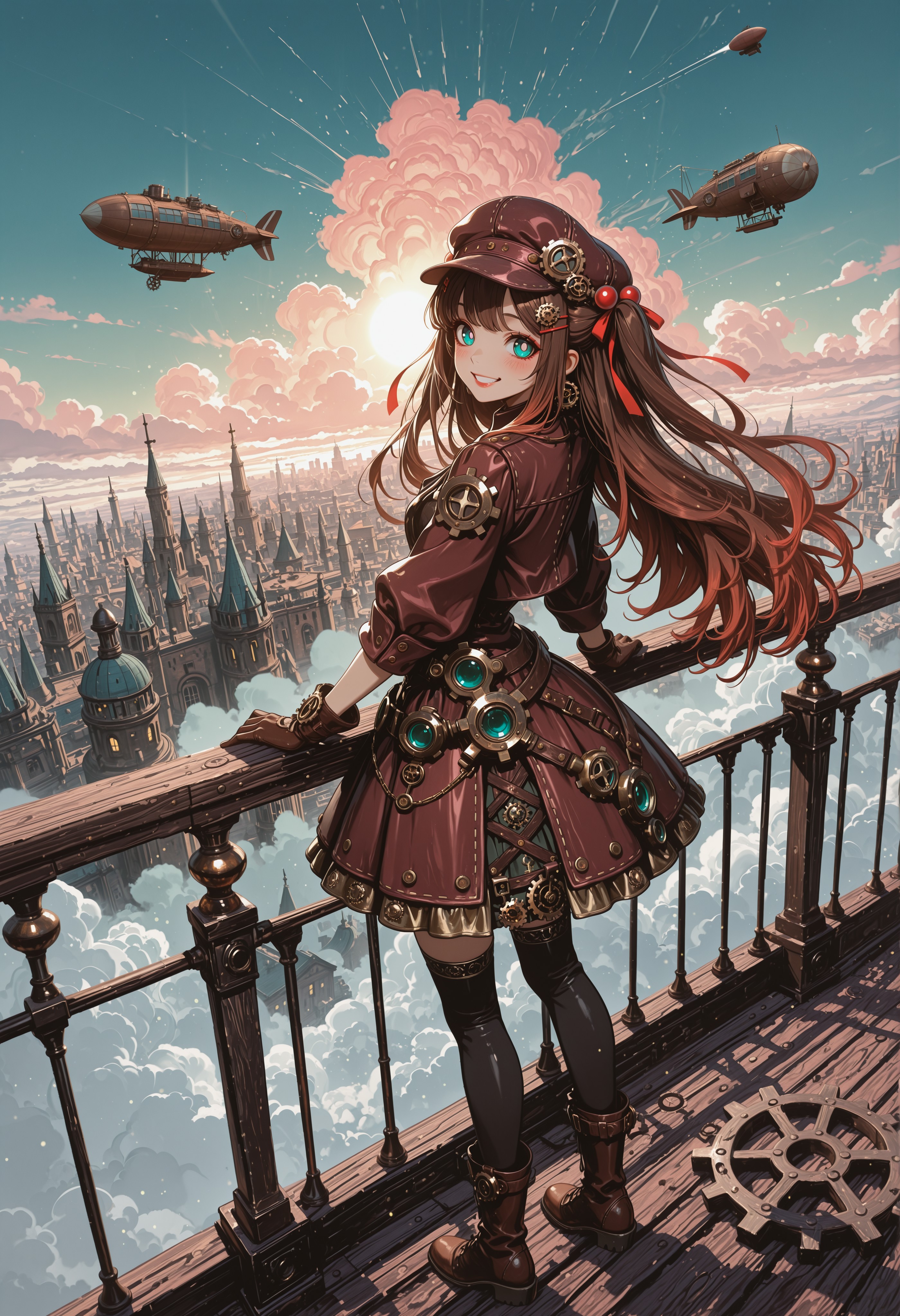 (steampunk:1.2), [[gears]], steampunk dress, asymmetrical skirt, cropped jacket, cabbie hat, gloves, boots, thighhighs, asymmetrical legwear,