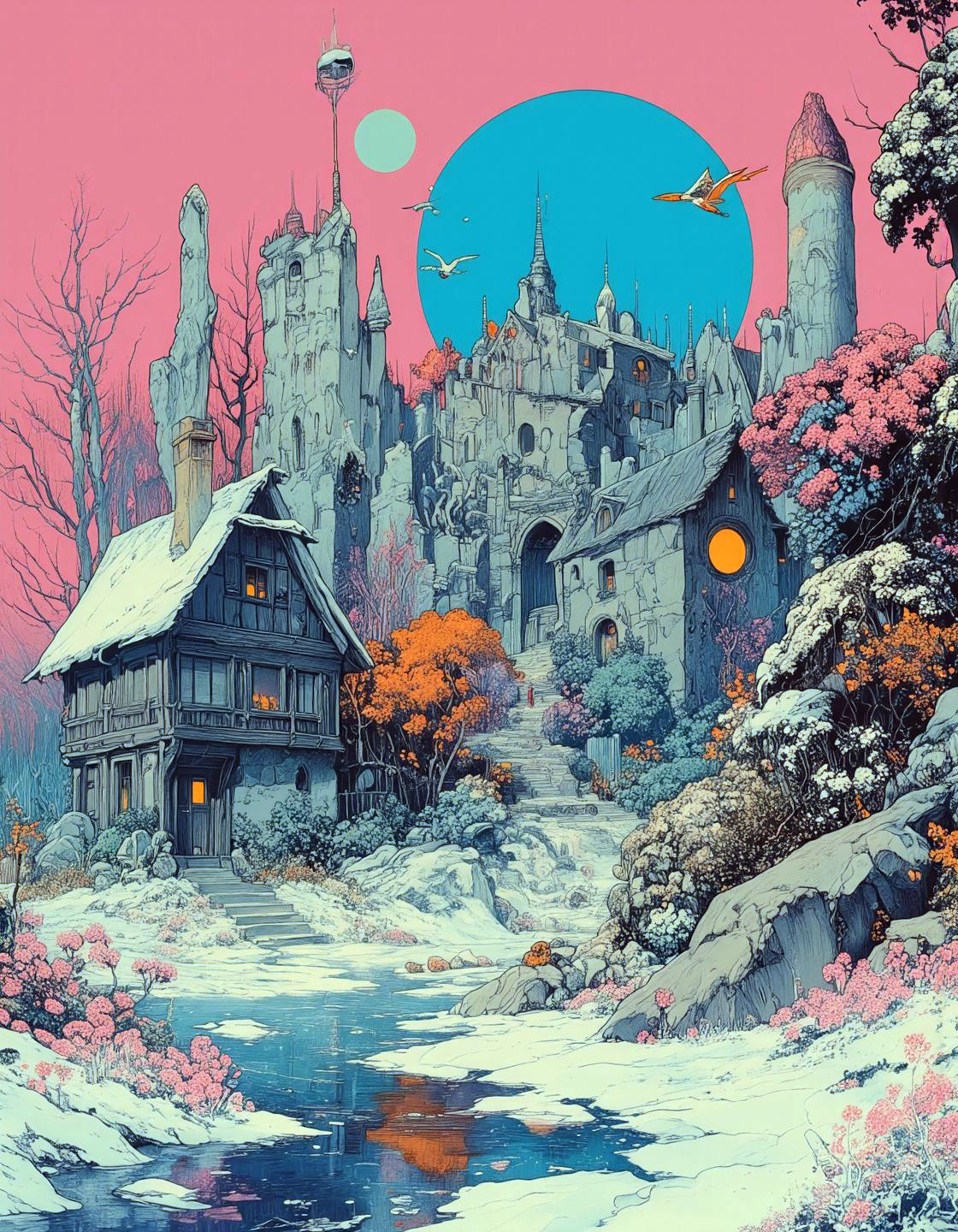 surrealist art anime artwork Salt flats reflecting pink horizon, frost flowers on ice, renaissance-style garden folly,,Multidimensional fantasy ecosystem containing fragmenting reality fields causing overlapping biome layers governed by ancient druidic AI constructs,swamp-claimed citadel remains where flooded throne rooms shelter electric eel courts, their algae-covered walls vibrating with peat-preserved war cries, lake, Mechanical pilgrims with limbs transforming into tools, A lagoon holding liquefied starlight coral towers emitting radio frequencies, black hole accretion disk as polar light show, A proliferation of ferromagnetic sunflowers tracking solar flares, years lasting minutes with hyper-evolution, rain that evaporates before landing, leaving scent-auras,,