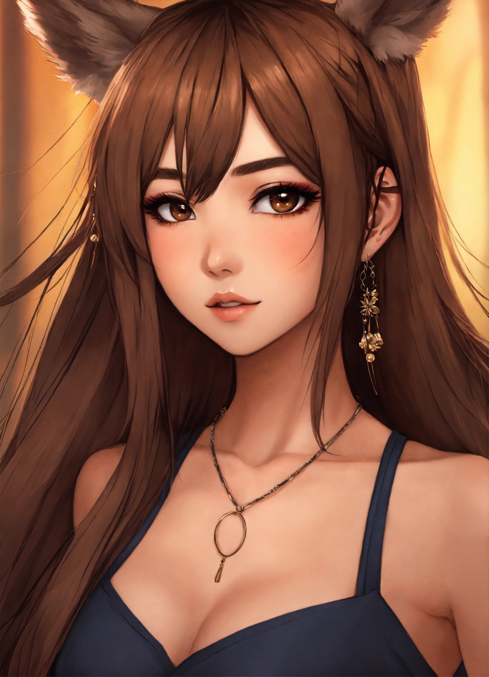 tan Asian female, long brown and black straight fluffy hair, heavy eyeliner, makeup, anime, no imperfections