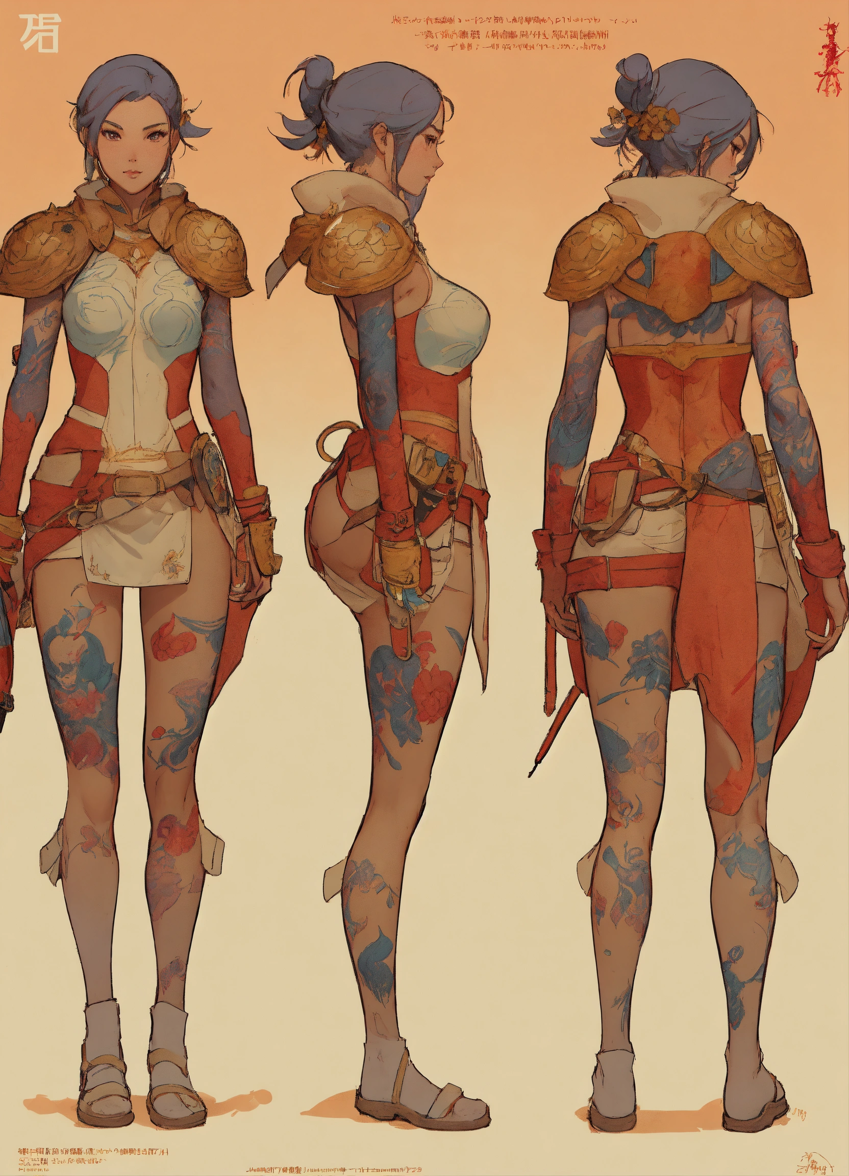 back tattoo, tattoed woman warrior, character sheet, character design, chart, reference sheet, multiple views, high detail, fine details, concept art, rossdraws, james jean, sakimichan, Moebius, Jayison Devadas, Phuoc Quan, studio ghibli