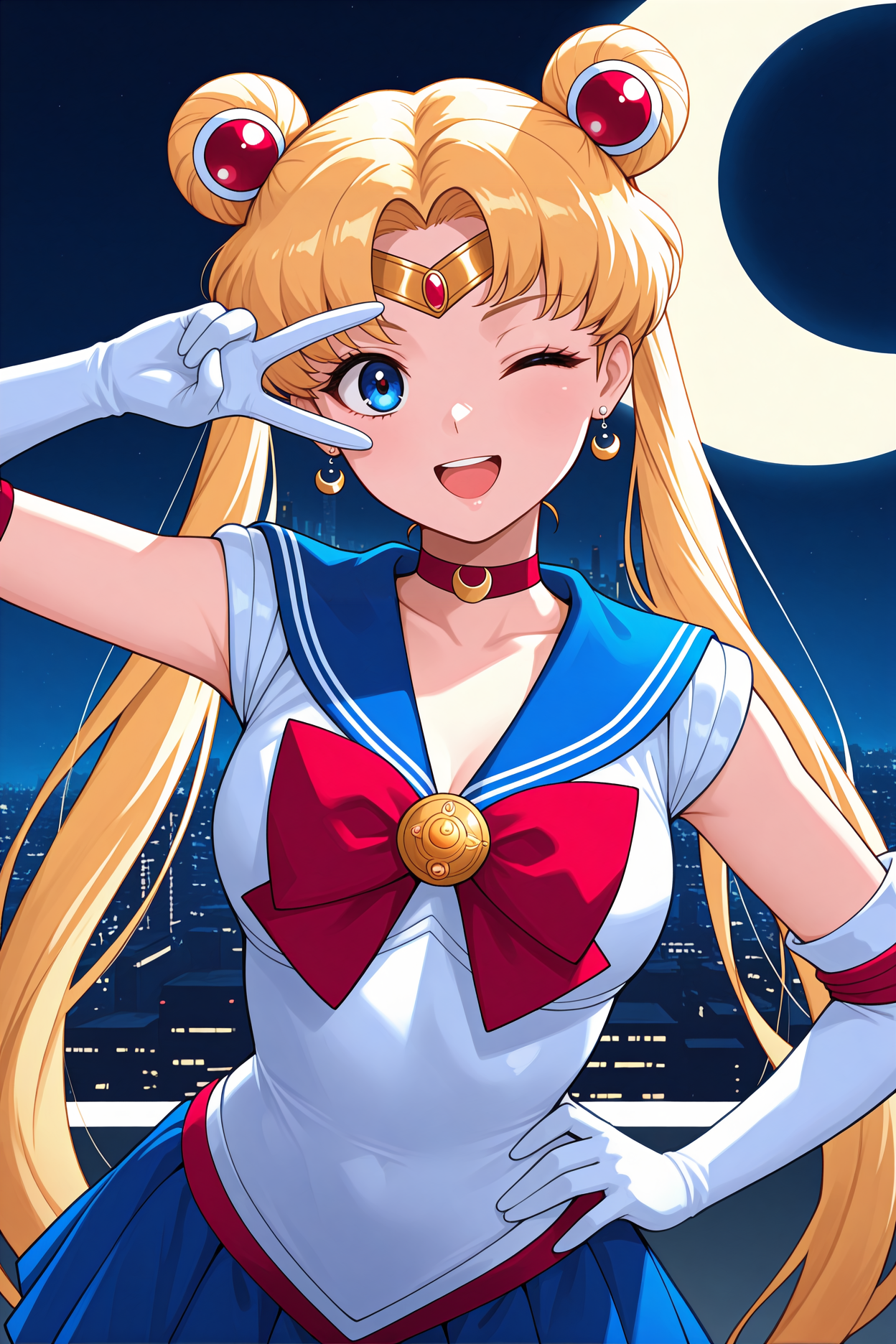 masterpiece, best quality, 1girl, solo, <lora:sailormoon-illu-nvwls-v1-000006:1> slmn, twintails, double bun, blonde hair, very long hair, blue eyes, parted bangs, gold circlet, hair ornament, crescent earrings, red choker, blue sailor collar, red bowtie, gold brooch, white leotard, white shirt, sleeveless, blue skirt, miniskirt, white gloves, elbow gloves, upper body, looking at viewer, night sky, city, smile, open mouth, v over eye, moon, straight on, hand on hip, wink