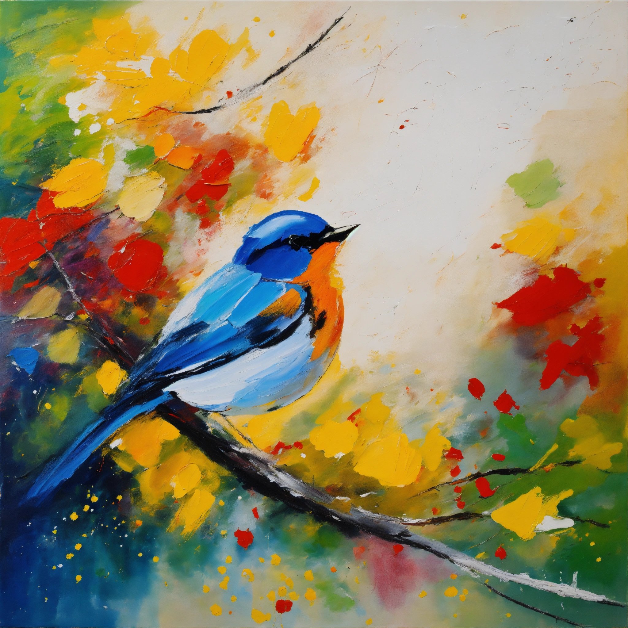 draw an abstract painting, mixing acrylics, palette knife and brush with primary colors, white background, trees and birds